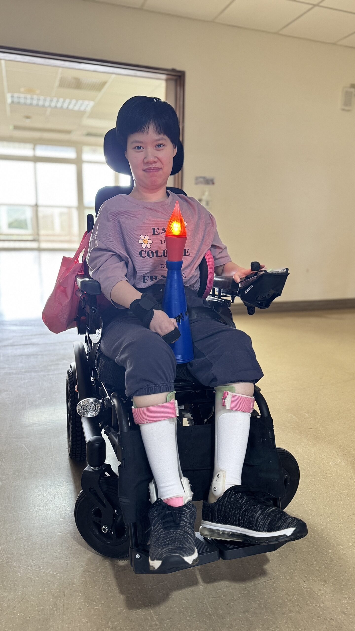 另一位感動全場的是高照護專區的院生小文。小文同樣罹患重度腦麻,長年與腸扭轉及身體退化奮戰,手部功能受限的他,靠雙腳操控助行器與輪椅,成為復健室裡最勤奮的身影。運動會中,他在助行器與輪椅競速兩項比賽中脫穎而出,闖進前三名,更被大家暱稱為「飛毛腿」。當他奮力衝過終點,全場皆為他的毅力與精神動容。