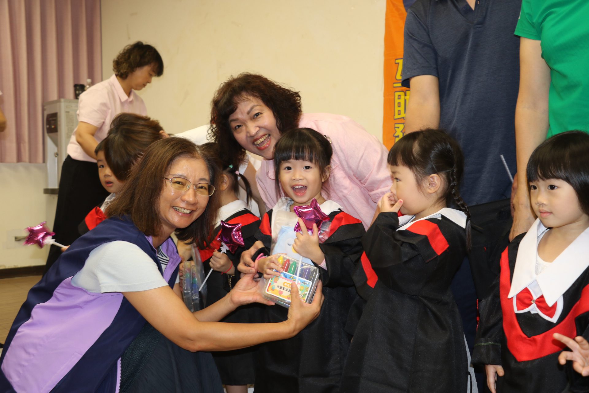 「小小的手掌會開花,開出一朵童年的花…謝謝你陪我長大,走過春秋和冬夏。」新北市托育人員互助發展協會今(2)日為一群居家托育的孩子舉辦首屆畢業典禮,每位寶貝在居托保母的牽手下,興奮地走進會場,現場的爸媽和阿公阿嬤叫得比孩子還大聲。保母為孩子戴上小小方帽並撥穗,頒發結業證書,社會局兒童托育科長陳麗雲代表致贈禮物,祝福每位結業生升上幼兒園探索更多的世界,也感謝每位居托保母的辛勞。