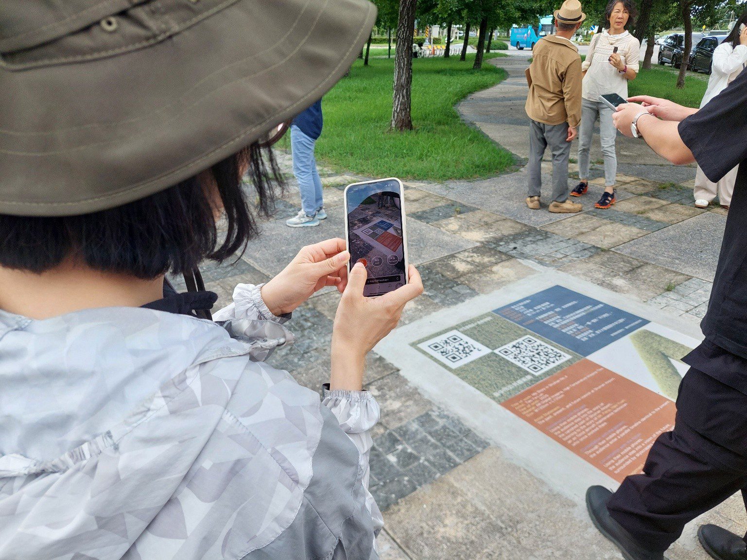 民眾透過掃描說明牌磁磚的QRcode體驗《我在水湳的故事》