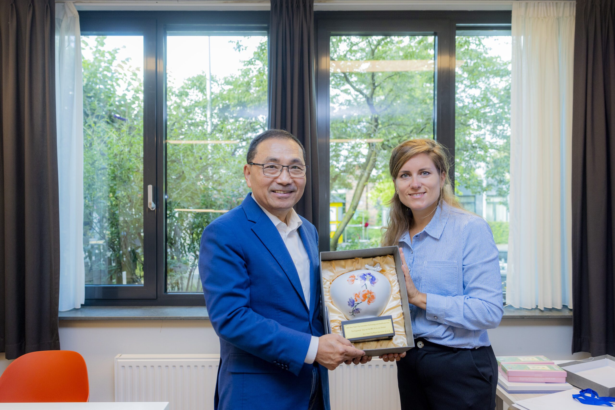 霍格威村(The Hogeweyk),是全球第一座「失智照護社區」,侯友宜與霍格威村資深顧問Iris van Slooten。(新北市政府提供)