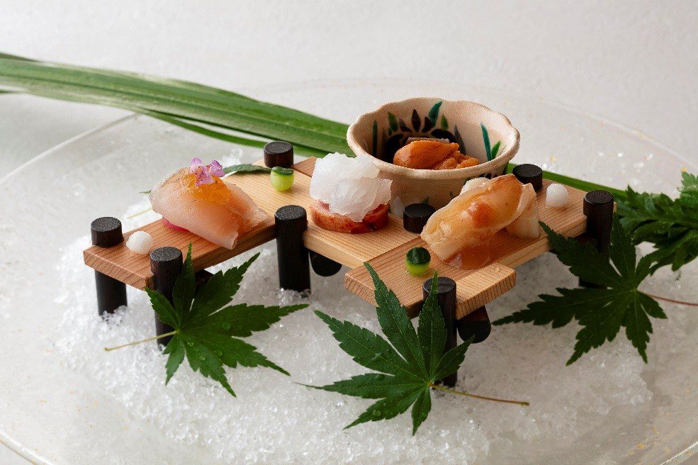 透明冰皿、襯托季節感的青葉,整齊細緻切片的魚料,散發清涼雅致的氛圍。圖片提供:銀座 小十