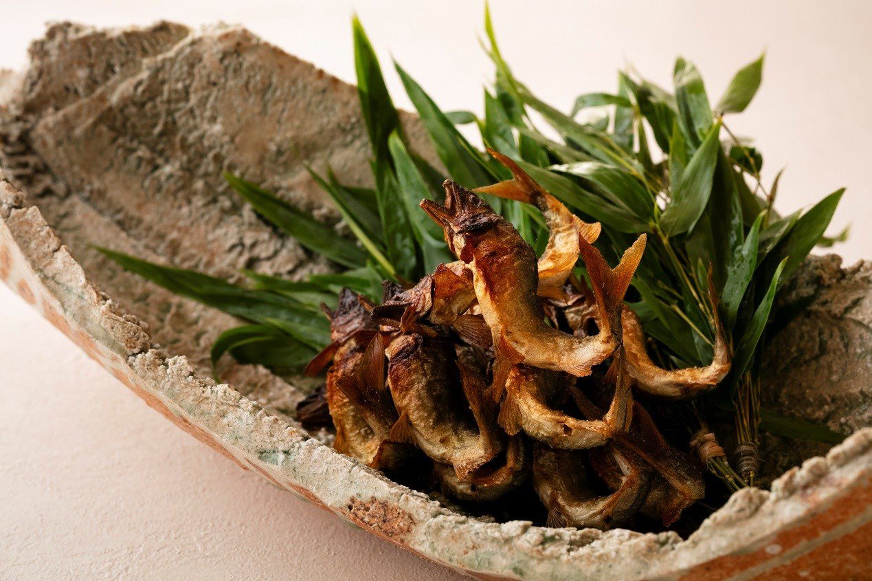 盛於燒締陶器中的烤物。酥香四溢的烤香魚彷彿在綠葉綴映的季節中樂游。  圖片提供:銀座 小十