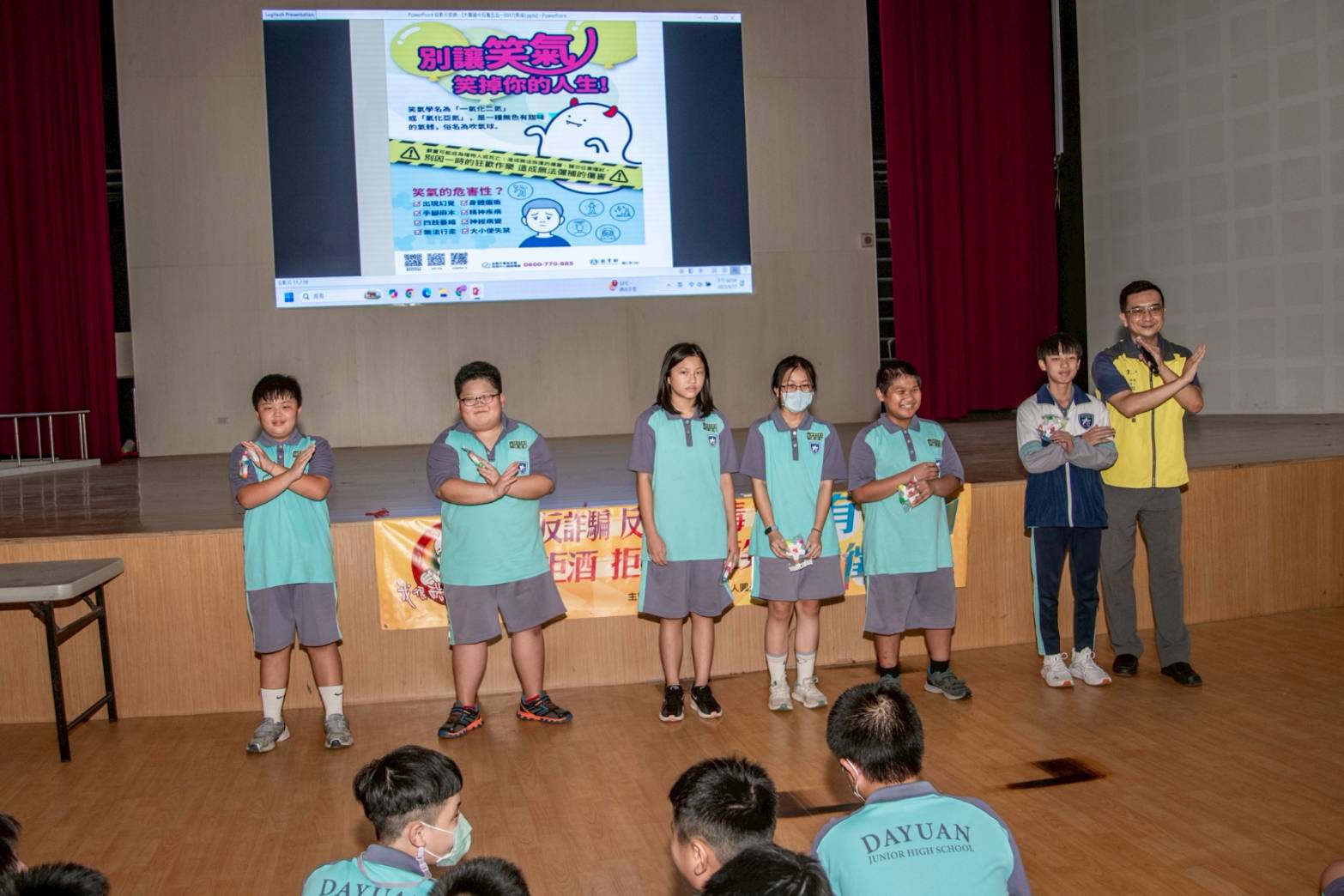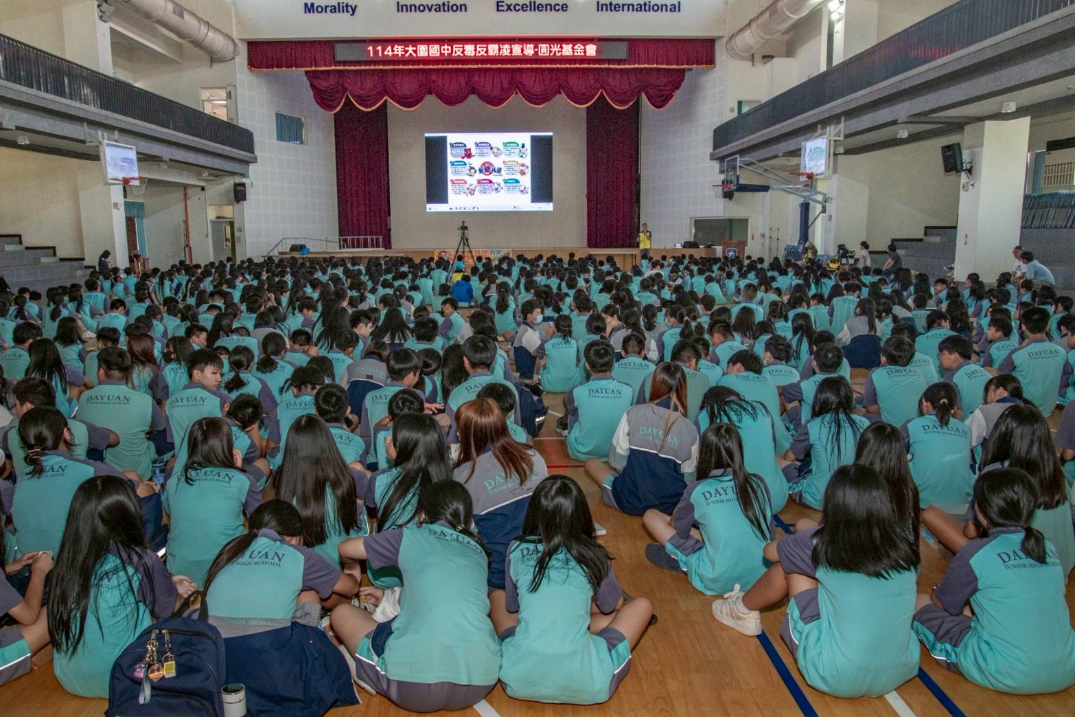 「七合一反毒宣導」是由財團法人圓光文教基金會舉辦,由各級學校申請派遣專業反毒講師,分赴各校進行「七合一反毒宣導」(拒毒、反霸凌、反詐騙、拒菸、拒笑氣、拒檳榔、拒酒精)宣講,30年來,每年連同社區約有200多場,頗獲各校的好評。昨日下午會稽國中校長李文義接受圓光基金會邀請,利用公餘到大園國中客串宣導,校長楊震秋到場致意,學務主任謝向棠、生教組長陳聖典全程陪同,現場約有400餘位師生到場聽講,體育館座無虛席。