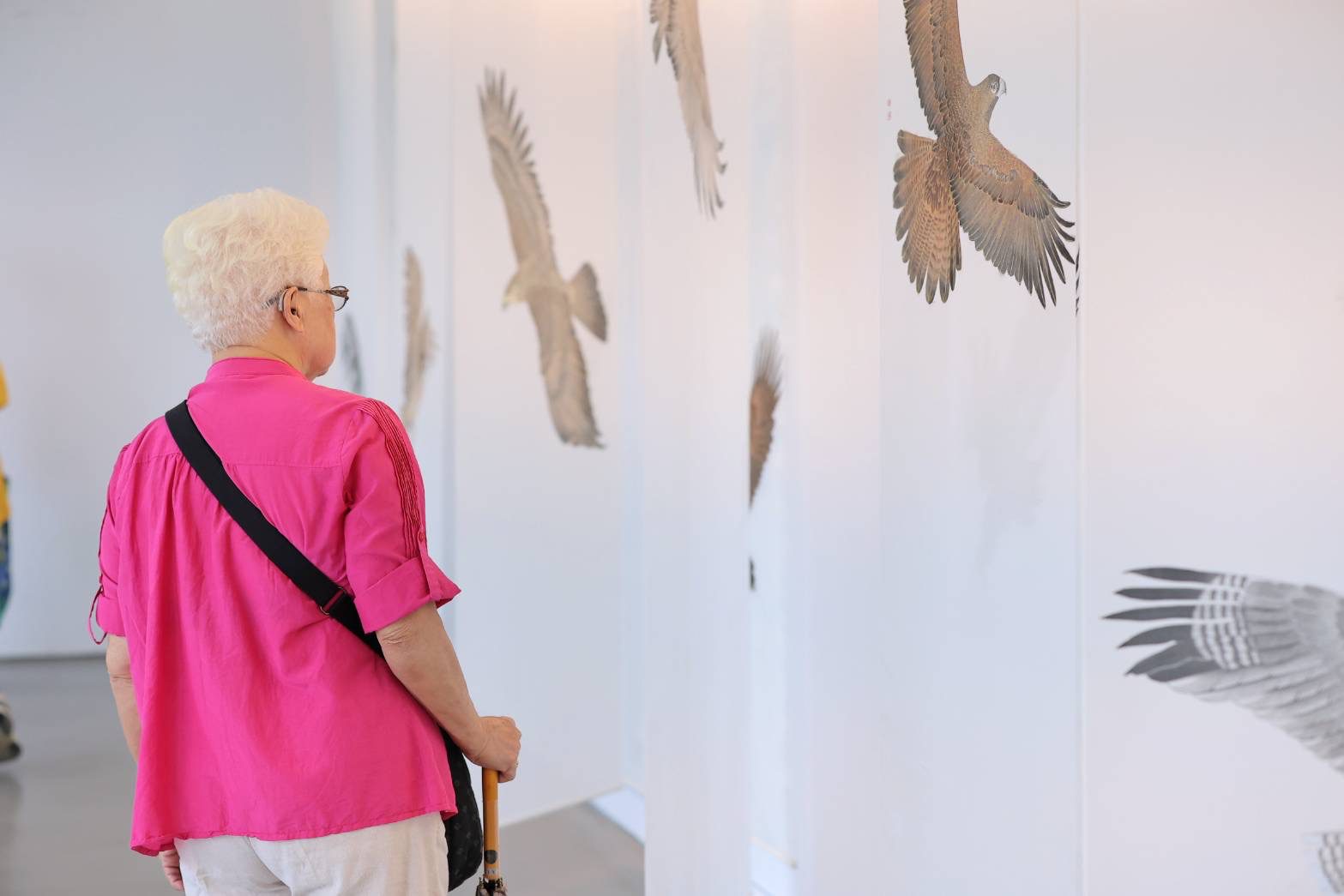 其中,以基隆港灣為靈感的「飛鳶」系列最受矚目。藝術家以嚴謹筆法描繪老鷹翱翔天際的雄姿,將工筆畫的細膩與自然的自由精神相結合。展場設計也別具巧思,作品錯落懸掛於基隆港落地窗前,當微風吹拂時,畫作隨之輕盈搖曳,宛如真實飛鷹盤旋,為觀眾帶來沉浸式體驗。
