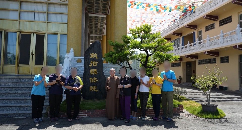 2025年5月8日淨慈寺開山住持炫慧法師.與寺院元老信眾及 巴麥欽哲仁波切的弟子於 講修堂前合影/ 仁波切表示,哪來的「趕出」一說?/圖 黃英傑 提供。