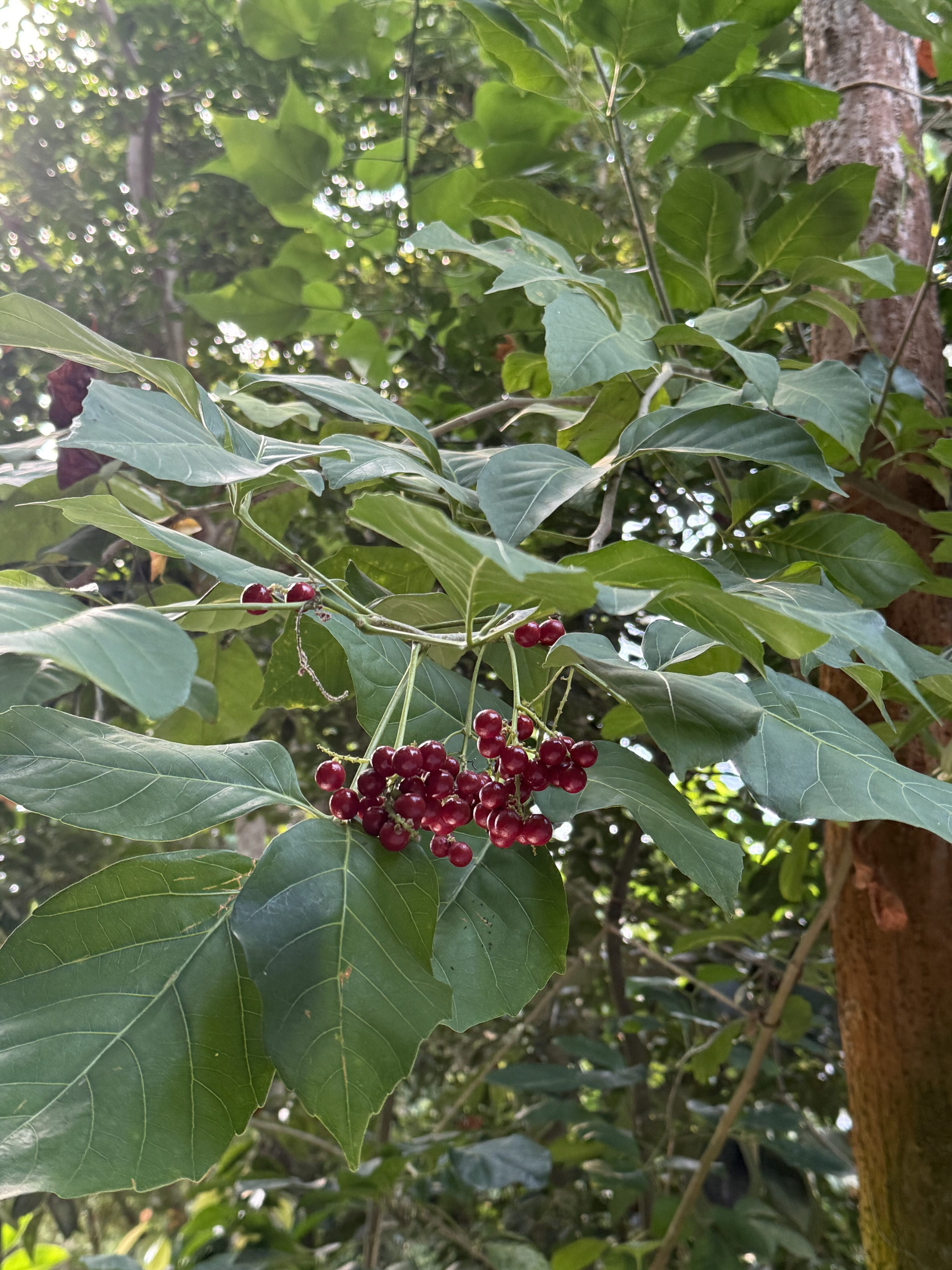 公園處處長藍舒凢指出,止宮樹原生於海邊,可作為海岸防風定沙的林帶。果實成熟時紅豔可愛,能栽培於庭園欣賞,兼具提供鳥類食餌的生態用途。止宮的葉片呈三葉狀,排列緊密、細緻小巧,走近觀察,還能看見葉緣的鋸齒紋理,在不同光照下折射出自然的靈動感,也展現了它高度的環境適應力。由於它鮮紅的果實,讓平時容易被忽略的樹影,近期成了最吸睛的焦點。從入口處往附生植物區方向前行,就能看見止宮樹上,高掛一串串飽滿剔透的果實,為這片城市中的綠色秘境,增添不少秋意的溫暖。