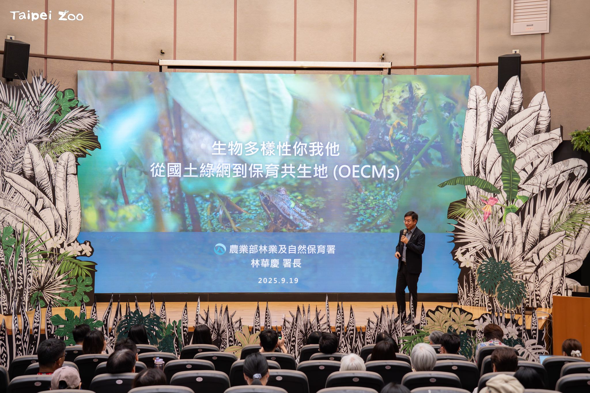 北市立動物園特別邀請農業部林業及自然保育署林華慶署長以「國土綠網」與「保育共生地(OECMs)」等重要生物多樣性保育推動政策進行專題演講。並以動物園與林保署及在地社區合作進行多年的台北赤蛙保育計畫為例,說明「保育共生地(Other Effective area-based Conservation Measures, OECMs)」理念,強調所有對生物多樣性有益的區域,不僅限於傳統的國家公園或保護區,無論是城市中的公園、企業綠地、社區菜園、農地,只要能透過有效管理來達到長期的保育效果,都能被視為一種「保育共生地」,於此同時亦能回應蒙特婁昆明生物多樣性框架的「30X30」目標。