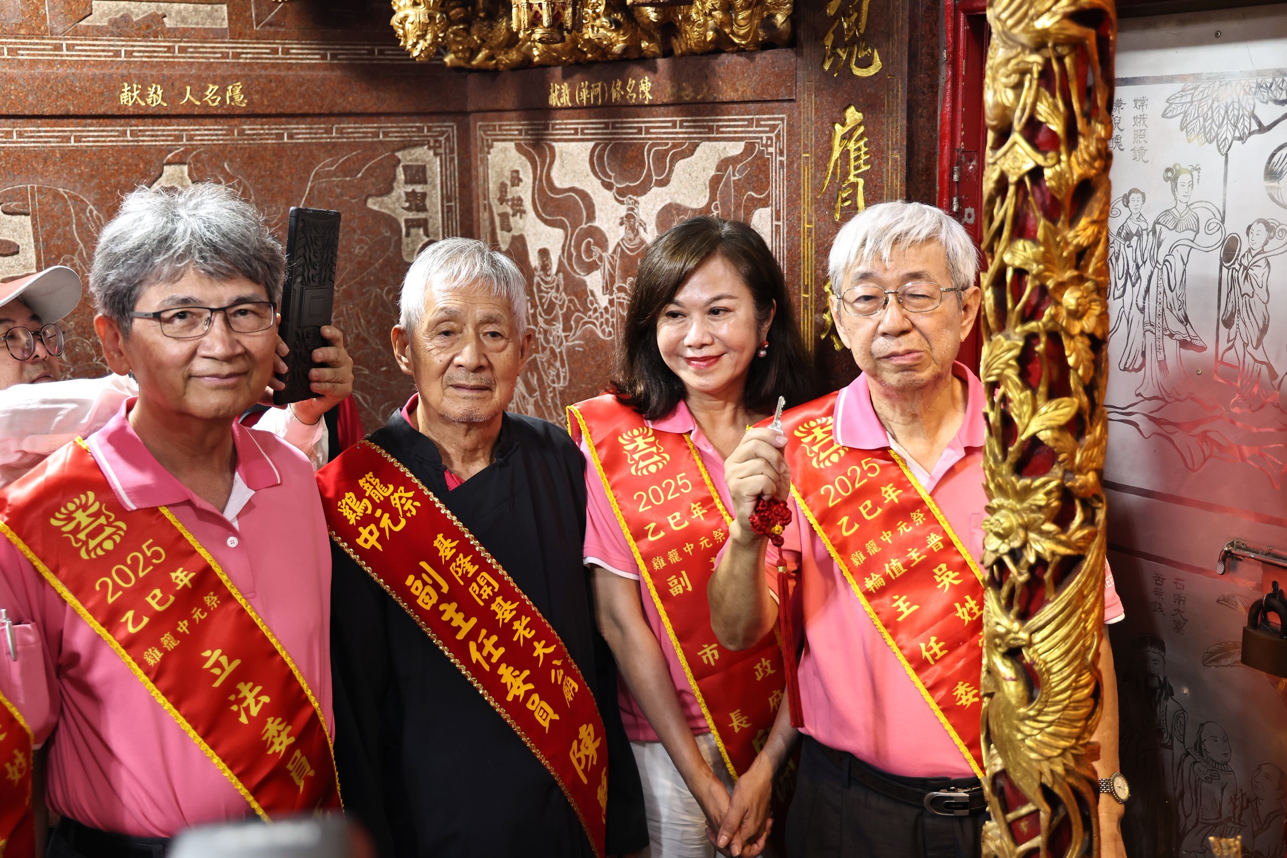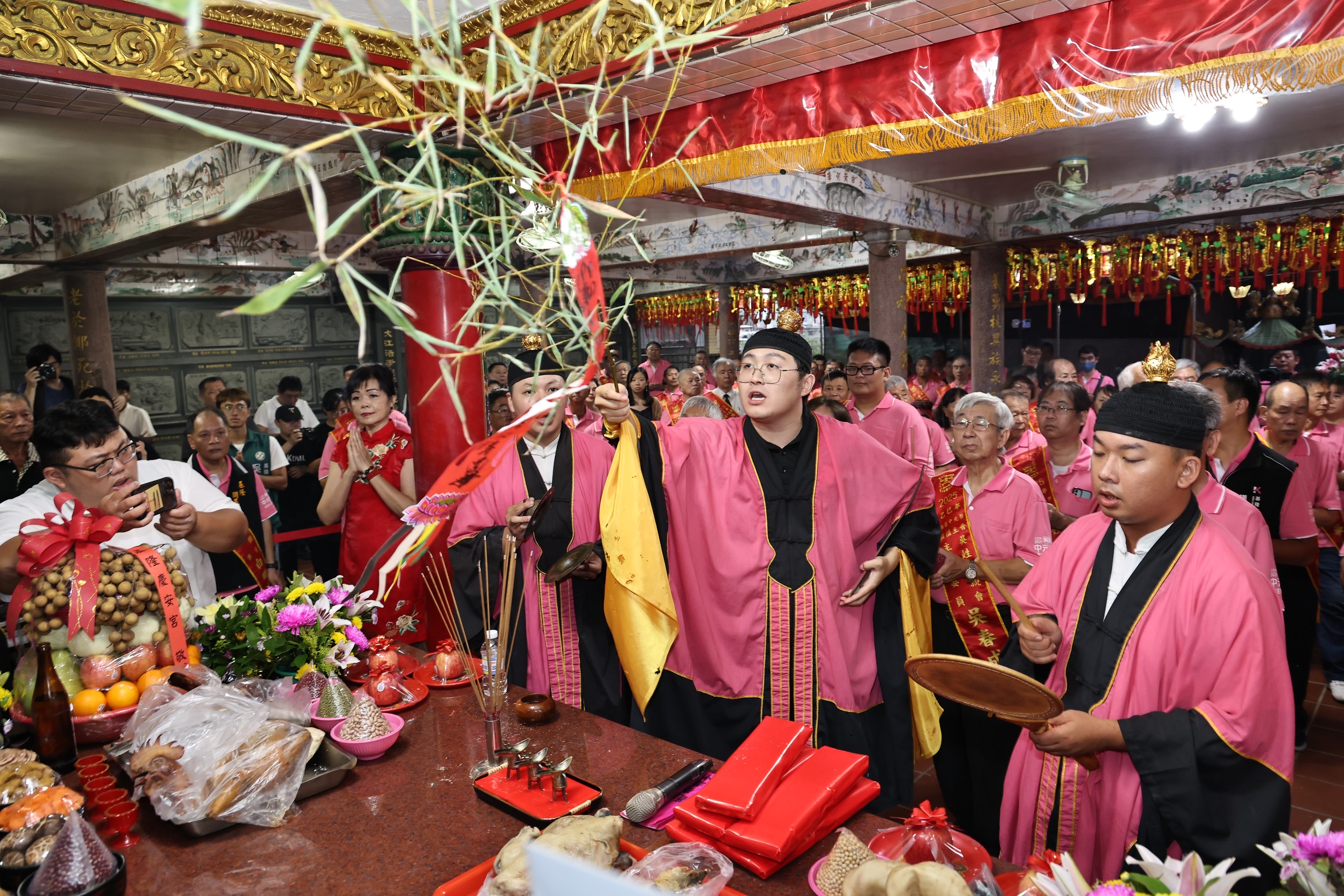 副市長邱佩琳、今年輪值主普吳姓宗親會主委吳春成、理事長吳阿彬、執行長吳政材,以及各姓宗親會代表齊聚老大公廟,在道長帶領下完成淨壇、上香、獻花獻果等儀式,取出錦盒中登記簿與鑰匙,記錄時辰後共同關上龕門,象徵陰陽兩界分隔、人間七月結束,為中元祭重要科儀之一。