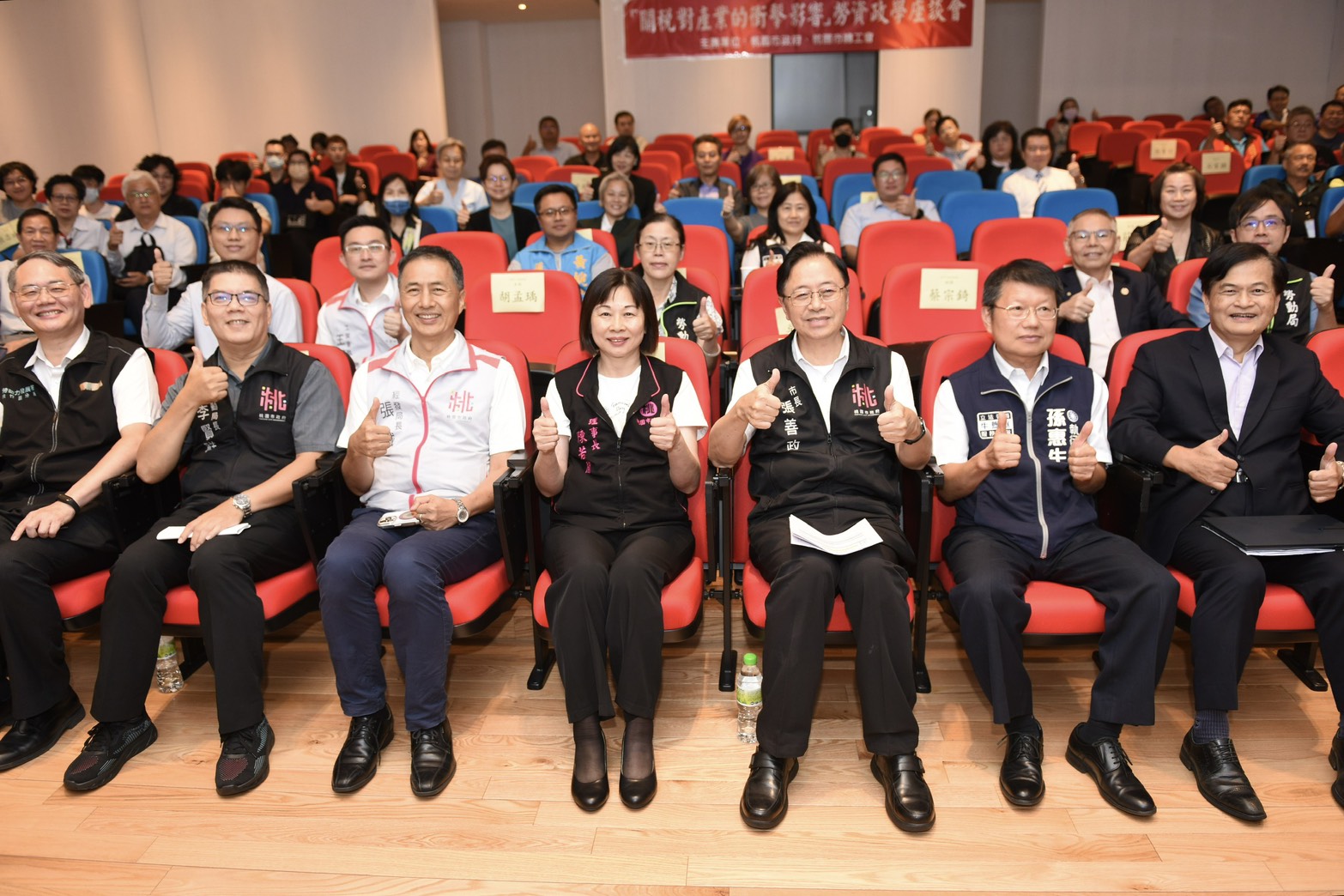 桃園市總工會22日舉行「關稅對產業的衝擊影響」勞資座談,桃園市長張善政親自出席(右3)親自出席,右四為桃園市總工會理事長陳若蘭。