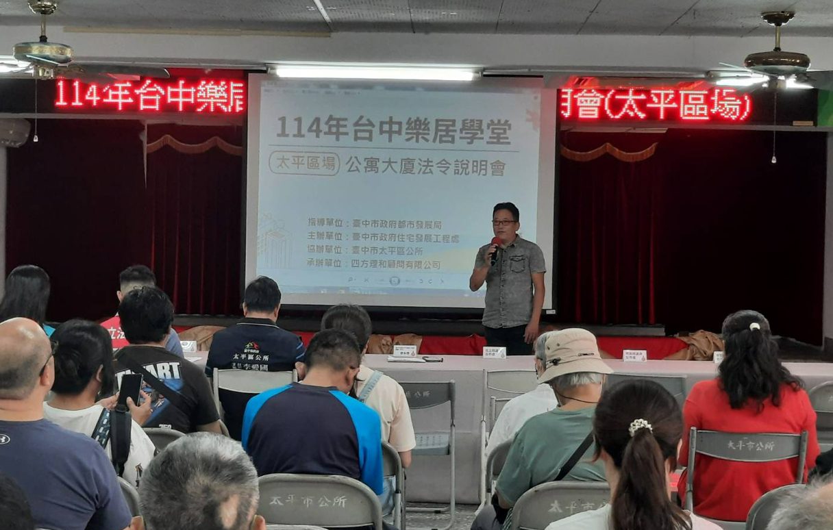 台中市政府都市發展局住宅發展工程處於今(4)日在太平區公所舉辦今114年度第4場次「台中樂居學堂(公寓大廈法令說明會)」,由住宅處及太平區公所共同舉辦,近百名住戶及社區管理服務人員等報名共襄盛舉,11、12月將辦理最後2場次,相關資訊可至住宅處網站或加入台中樂居管家Line查詢。