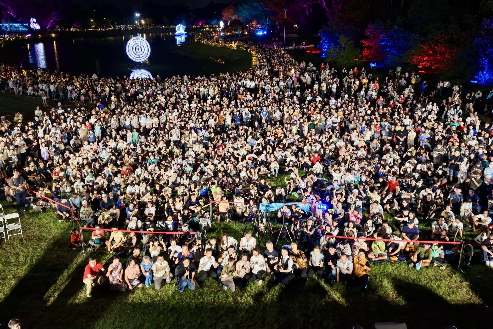 隨後,「鐵肺歌后」戴愛玲帶來多首膾炙人口的經典歌曲,高亢歌聲與燈光投影交織,宛如星光與旋律在夜空共舞。「情歌王子」李聖傑則以深情旋律牽動觀眾心弦,從輕柔情歌到激昂曲目,每一首都與湖面倒映的光影互動,將現場氣氛推向高潮。黃敏惠市長與貴賓站在湖畔,與遊客共享這場幸福、夢幻交織的夜晚,民眾紛紛拿出手機捕捉精彩瞬間。