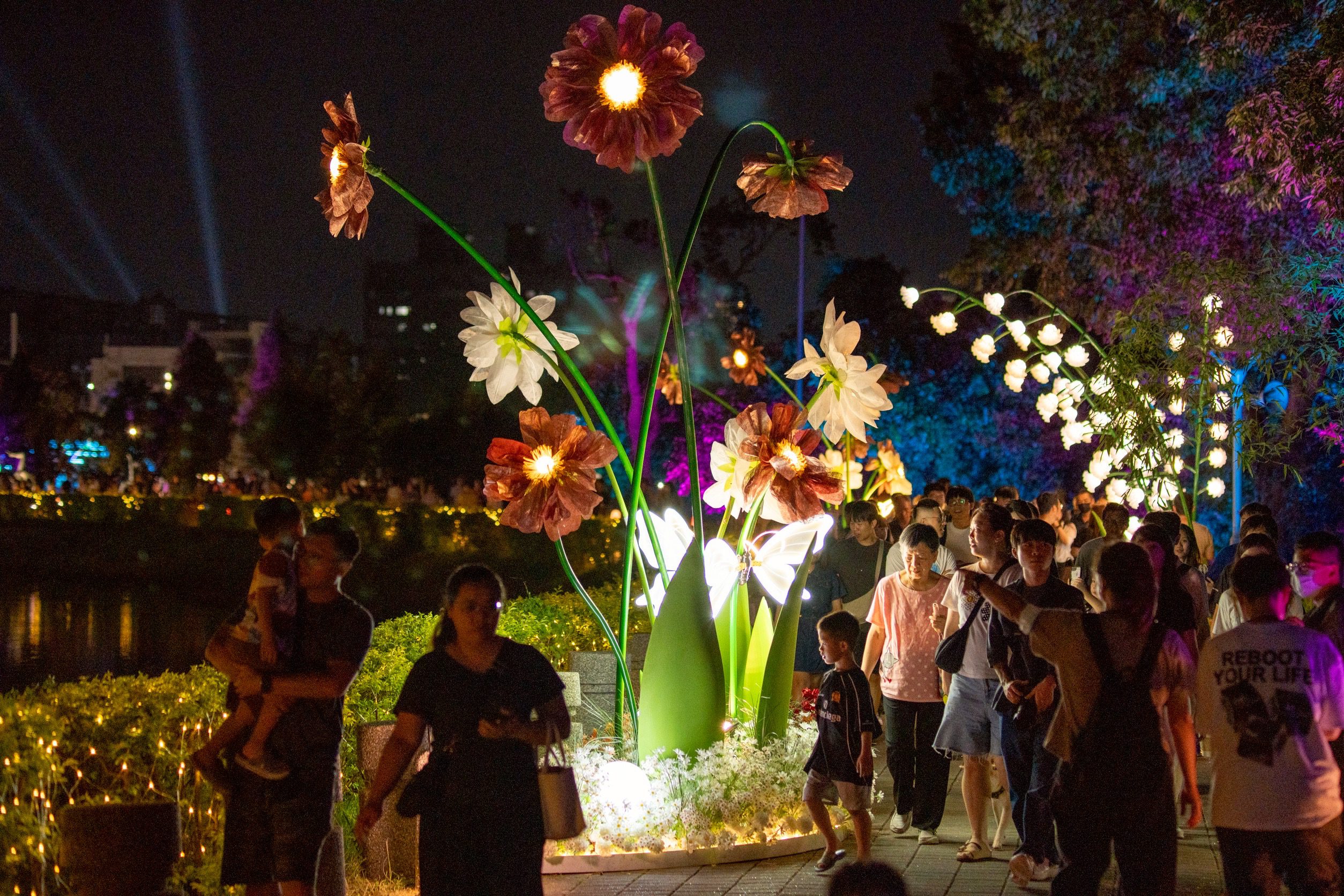 2025嘉義市光織影舞今(4)日在北香湖公園璀璨登場。今年以「光影夢境」為主題,結合迪士尼經典動畫《愛麗絲夢遊仙境》,打造8大沉浸式展區。開幕首日,北香湖公園熱鬧非凡,遊客宛如置身光影魔法世界,每個角落都成為拍照打卡的熱門景點。現場不僅有亞洲知名幻術師與重量級歌手輪番演出,更有9米高愛麗絲造型立體裝置和北香湖上4.5米高旋轉月亮裝置點綴夜空,將整個場景打造得夢幻迷人、充滿奇幻魅力。