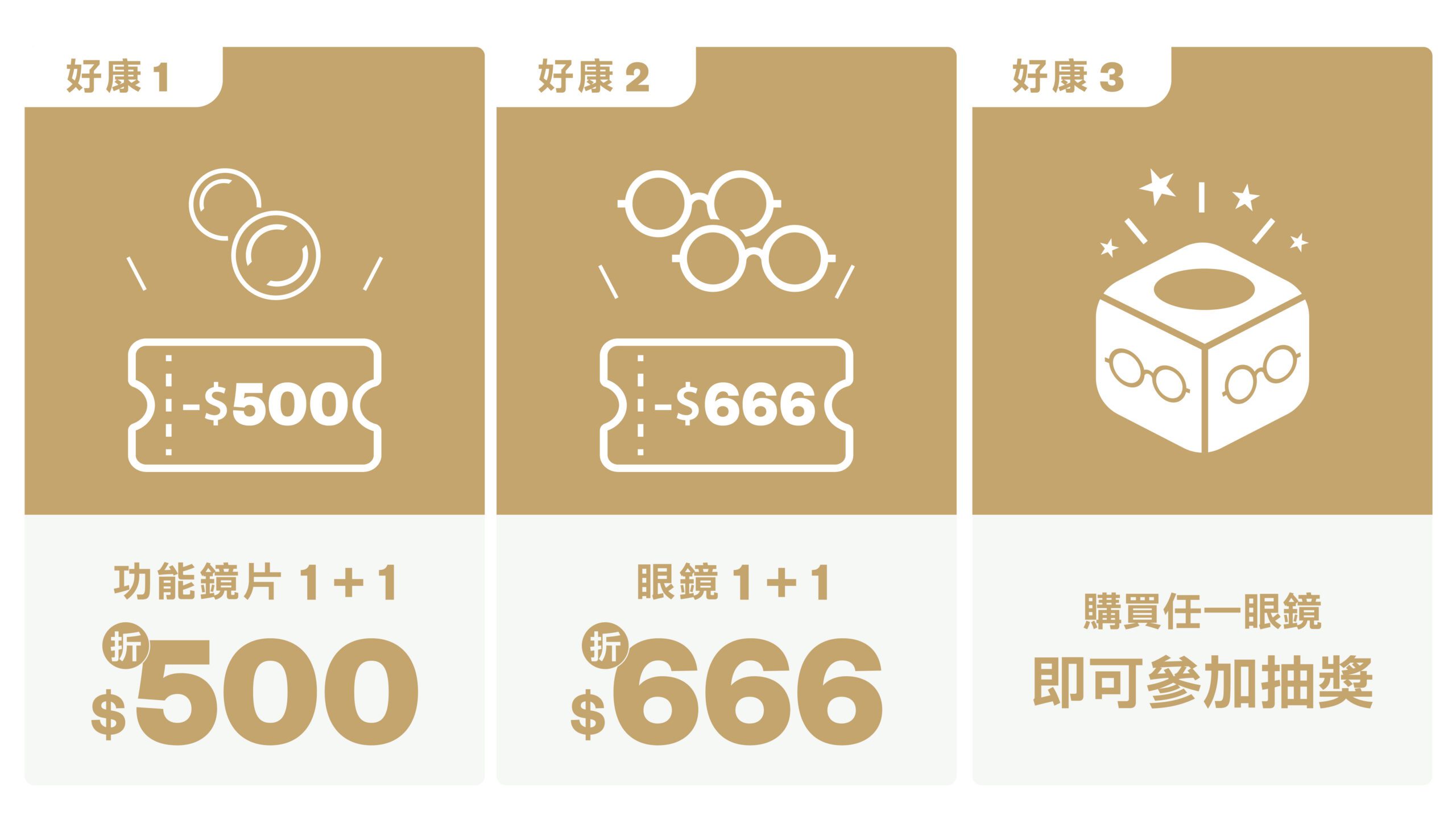 - 功能鏡片1+1折 NT$500元:IP聯名款、職人系列手作鏡框等,皆可參加。