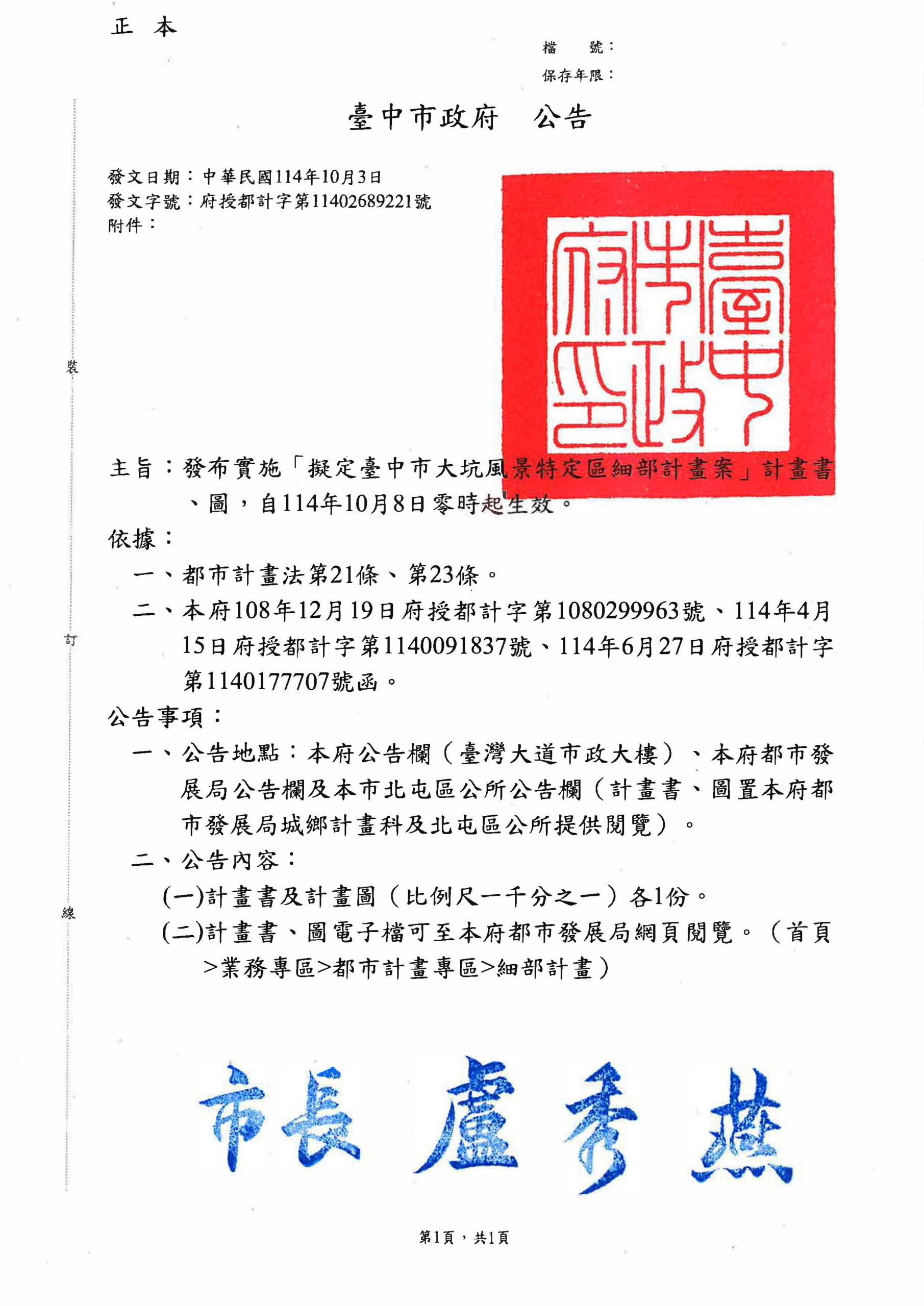 台中市政府公告發布實施「大坑風景特定區計畫書第一次通盤檢討(第一階段)」,自114年10月8日起生效。都發局說明,此次通盤檢討經各級都市計畫委員會審議通過、內政部核定及行政院核備,並由市府依法公告,藉此落實大坑地區的永續發展與環境管理。