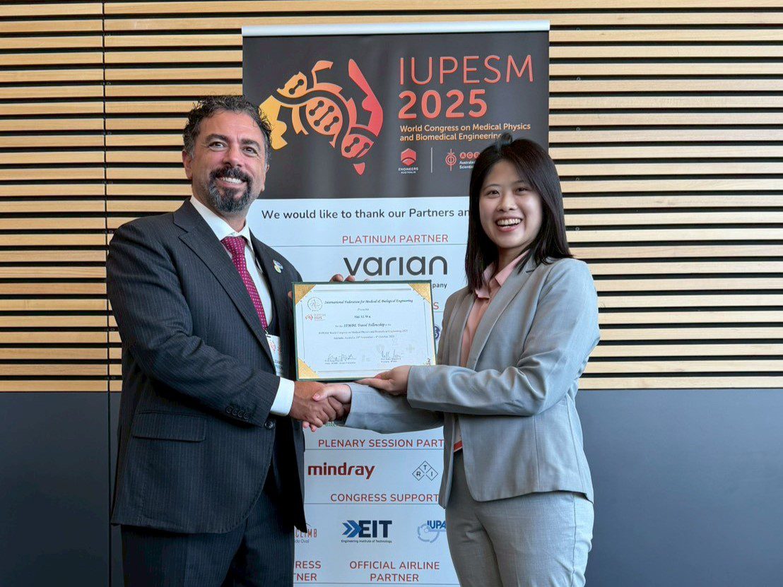中原大學醫療器材科技轉譯中心團隊亦隨同出席WC2025,展現長期深耕智慧醫療與國際合作的成果。其中,有兩位榮獲獎學金獲頒證書,包括:呂紹弘博士獲得IFMBE Early Career Researcher Travel Fellowship、吳詩儀同學得到IFMBE Students Travel Fellowship。IFMBE目前涵蓋76個會員國、逾15萬名會員,能在激烈競爭中通過嚴謹審查榮獲獎助學金與表揚,殊為不易。