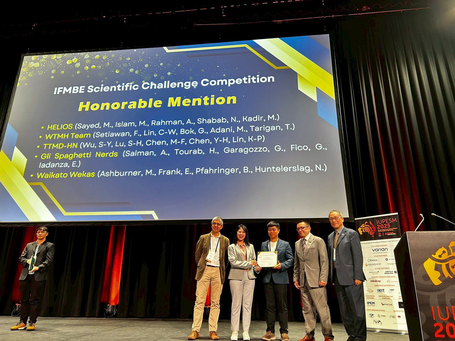 此外,醫療器材科技轉譯中心的呂紹弘、吳詩儀、陳美芬組成之團隊,日前參加IUPESM 2025科學挑戰賽,在22隊國際參賽隊伍中勇奪「榮譽獎」。此競賽是IFMBE數位健康部門在IFMBE項下之重要學術競賽,再次展現中原大學學術與實作並重的教育實力。