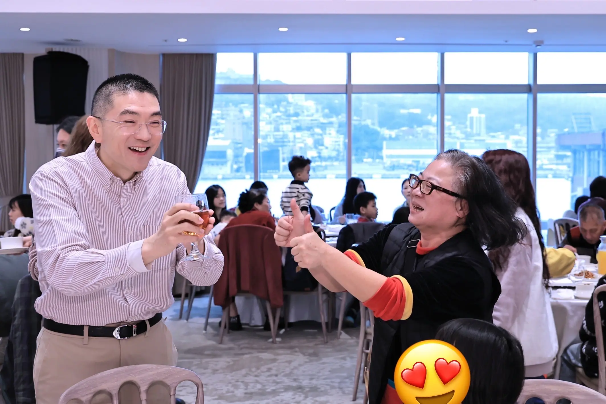 活動現場氣氛溫馨熱絡,謝國樑除表揚服務滿20年以上、25年以上的寄養家庭,並且感謝退休寄養家庭長期奉獻,也特別逐桌向大家敬酒、親切互動,關心大家的生活與學習情況,溫暖的交流讓整場餐敘更加增添團圓與陪伴的氛圍。