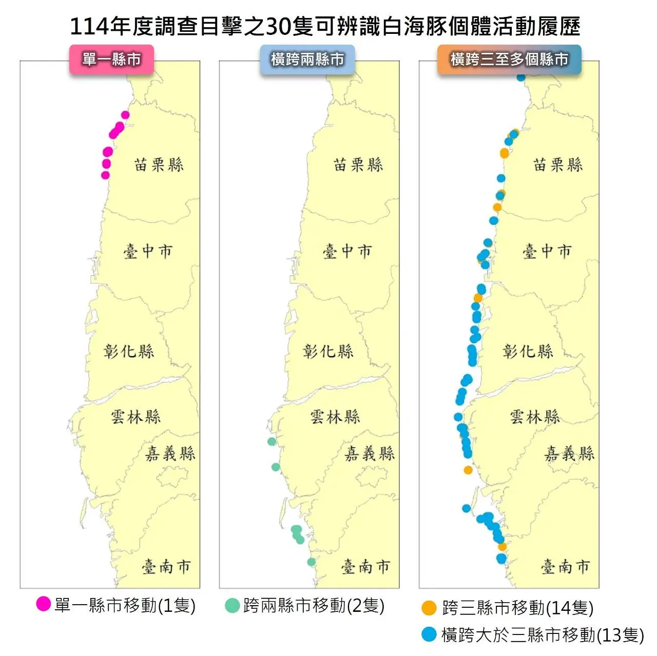 臺灣西部近岸及河口海域為中華白海豚主要棲息範圍,分布自苗栗至臺南沿海。海洋委員會海洋保育署公布114年度臺灣西部沿海白海豚監測成果,114年度海上調查期間共目擊白海豚17群次,其中8群次為母帶幼豚的育幼群畫面。