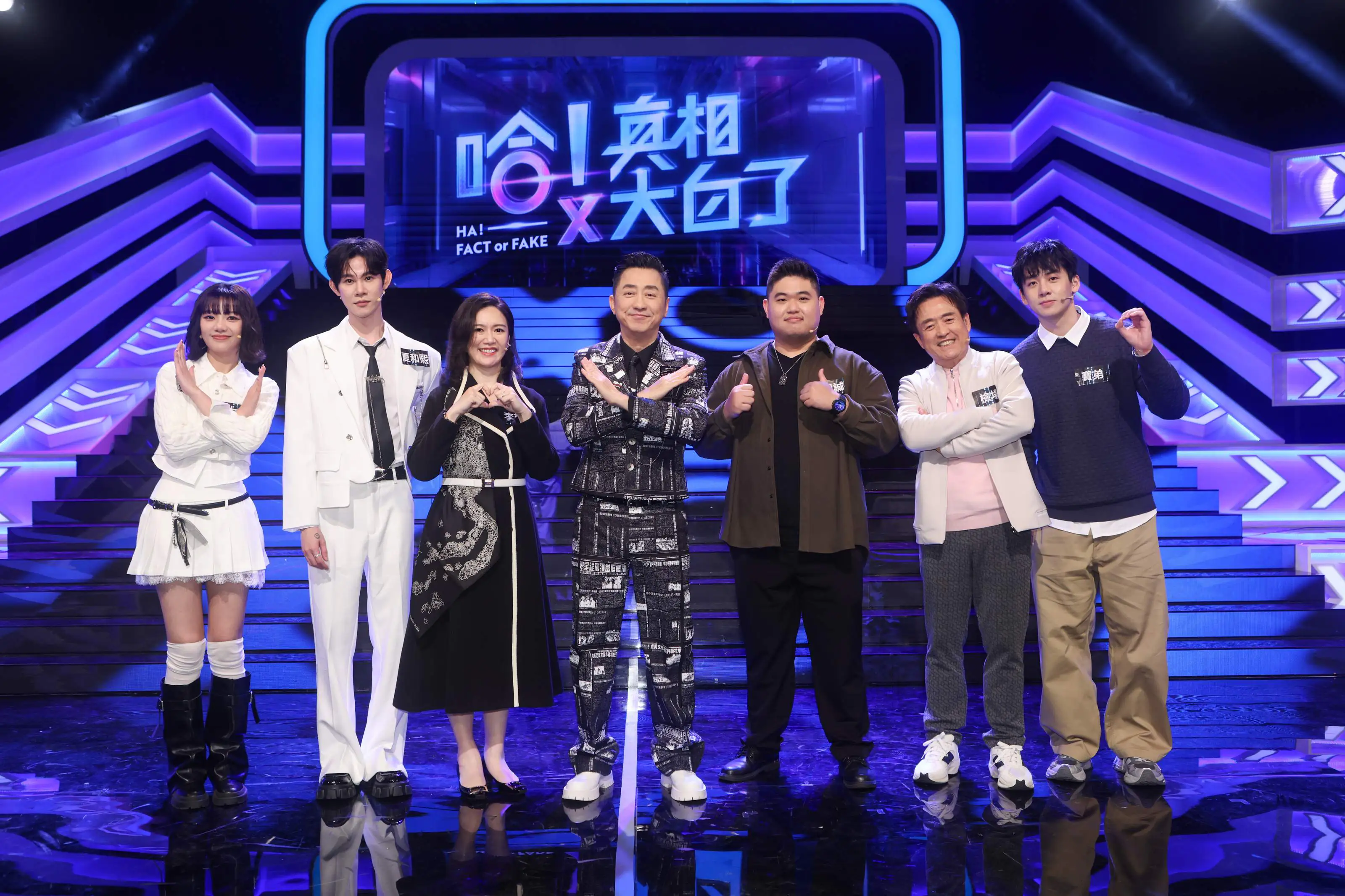 哈林庾澄慶(左四)主持《哈!真相大白了》邀(左起)木木、夏和熙、李薇薇,與(右起)寶弟、檢場、大坦誠同上節目 照片提供:公共電視