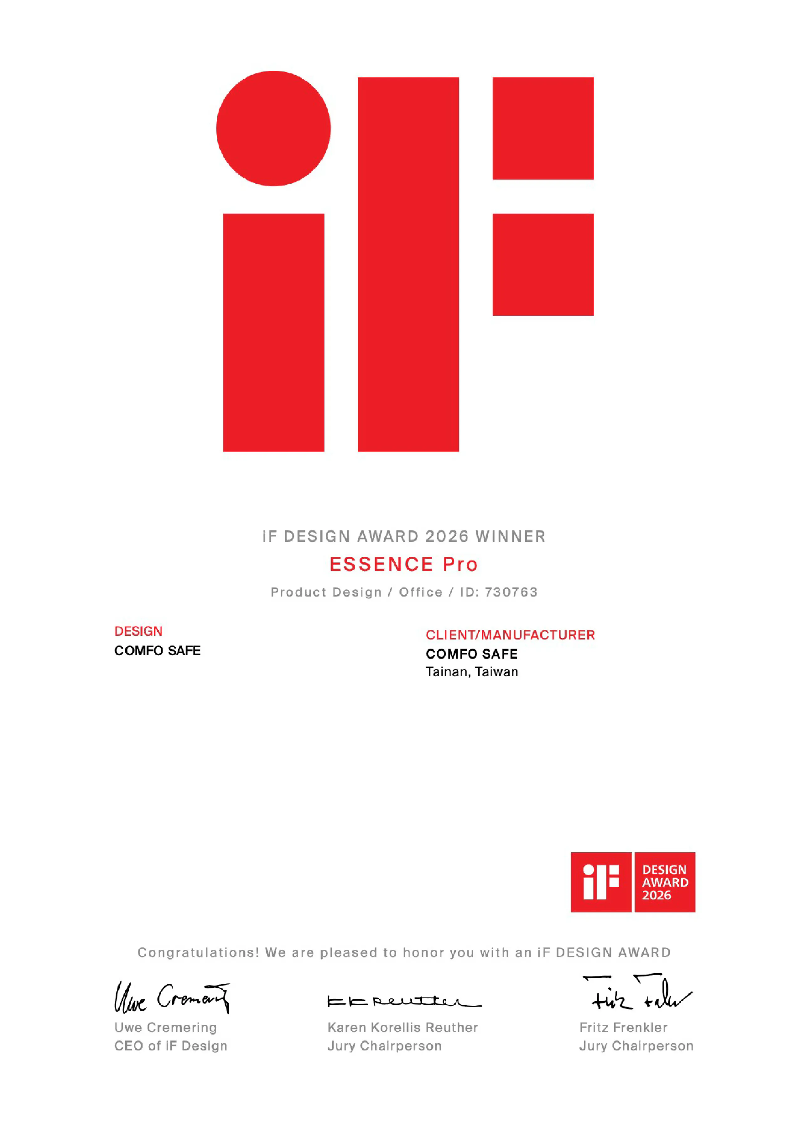 iF 評審團指出,該產品在安全設備設計上展現創新思維,成功突破傳統保險櫃冷硬的設計印象,在防護功能與空間美學之間取得良好平衡。