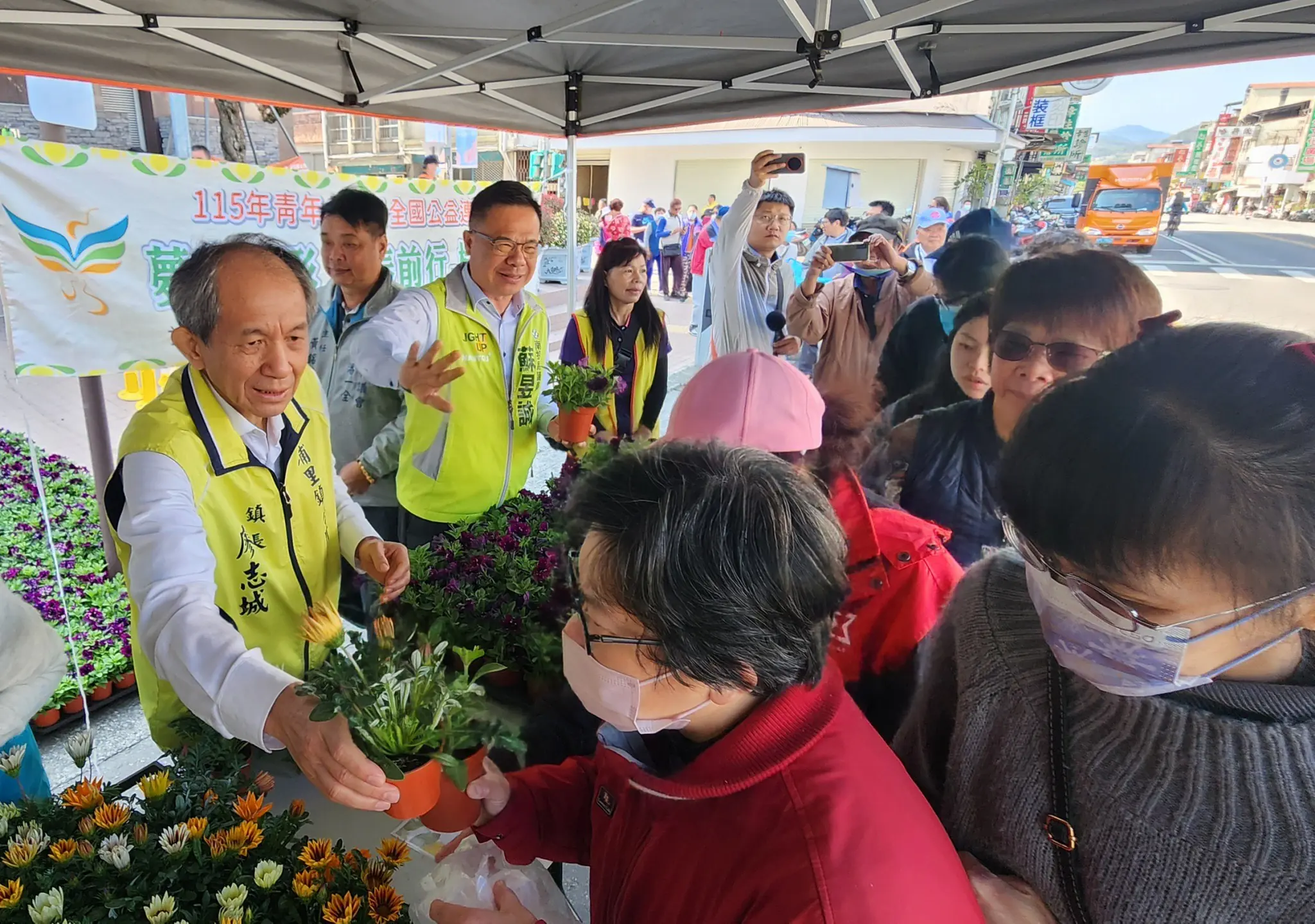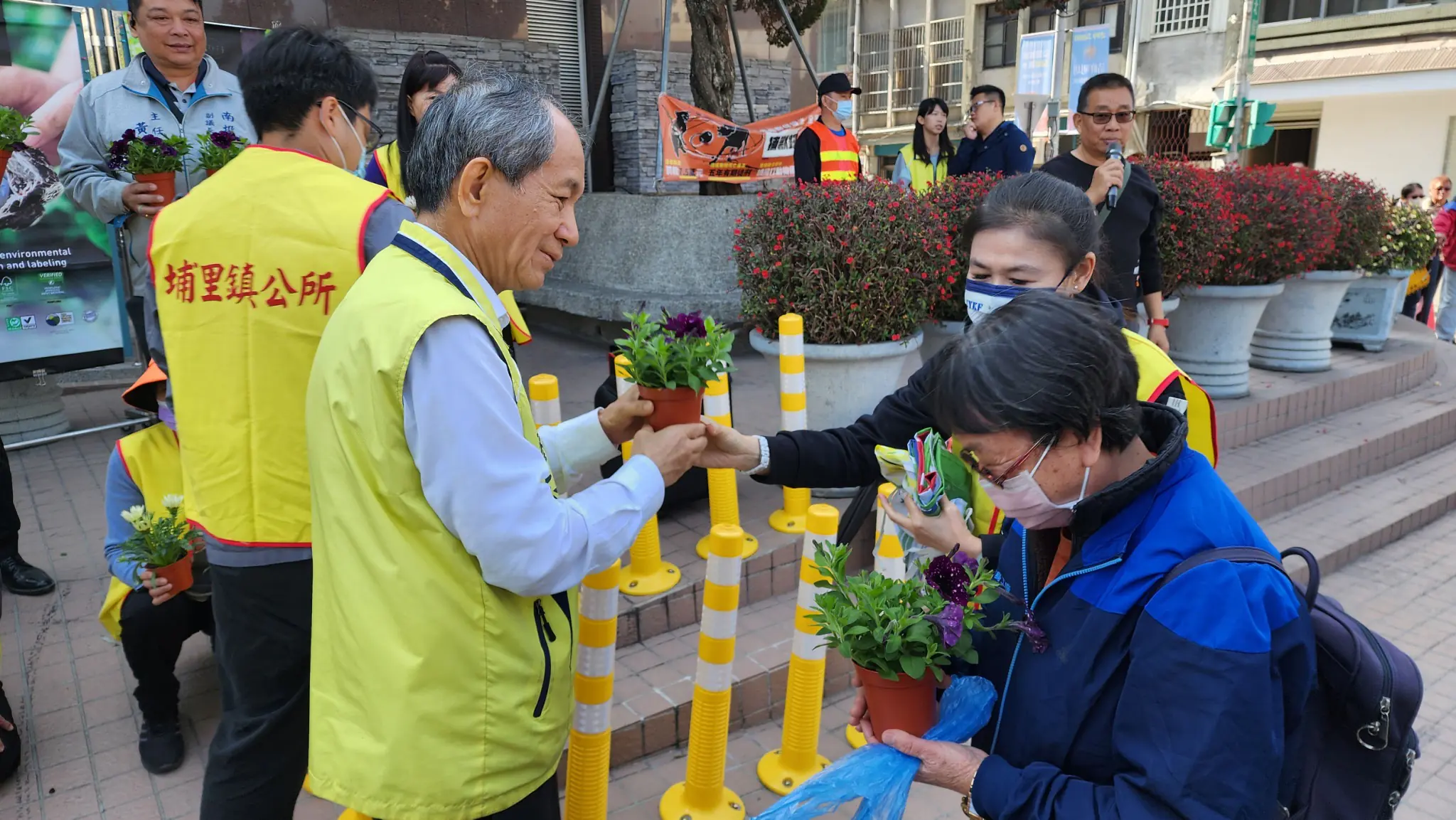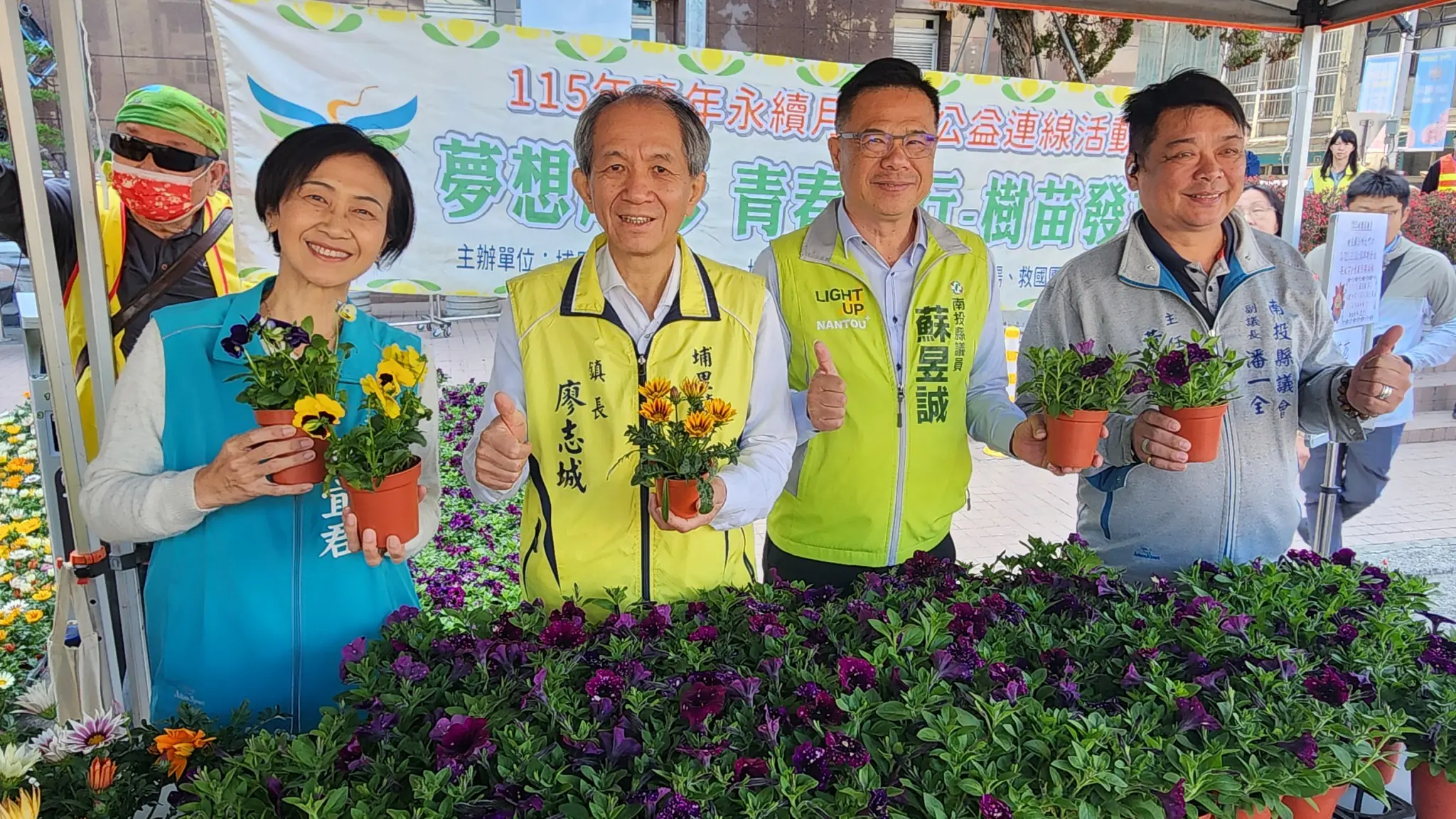 埔里公所聯合縣府、台一種苗場免費贈送樹苗、盆栽,上午10時於鎮公所前登場,鎮長廖志城、議員陳宜君、蘇昱誠、副議長潘一全辦公室主任黃銘輝、鎮代會主席林釧儀等人連同志工分送樹苗,今年贈送的樹苗有1000株,種類有小花紫薇、藍花楹、茶花、朱槿、含笑、雪茄花、五彩茉莉、日本女貞等,民眾每人限領2株,最受民眾青睞的茶花因數量有限,採限領1株,活動登場不久茶花就宣告送完;今年台一種苗場仍贊助這項活動,提供三色堇、妞妞牽牛(星空)及勳章菊等色彩繽紛的盆栽合計1000盆,民眾同樣可以選擇2盆帶回家。
