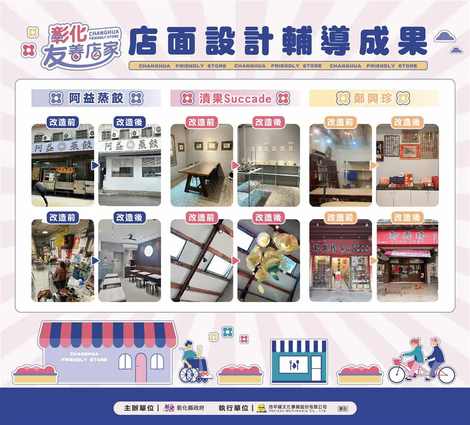 經濟暨綠能發展處表示,除透過創意行銷帶動商機,縣府也持續推動店面環境優化。去年共有101間友善店家入選店面設計改造輔導,針對品牌識別與場域空間進行升級,協助老店翻新並注入新創意。現場亦展示多個成功轉型案例,例如百年老店「鄭興珍」在保留歷史底蘊的同時展現時尚新貌;員林「漬果Succade」透過現代設計重新詮釋蜜餞文化;以及「阿益蒸餃」由第二代接班改革,打造嶄新的品牌形象。