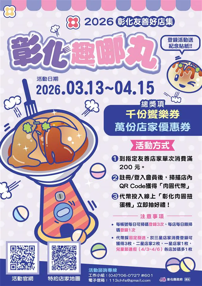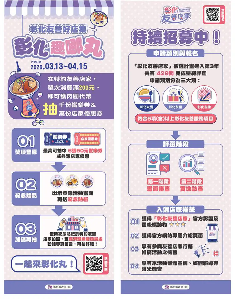彰化縣政府自113年推動「彰化友善店家」計畫並導入星級認證機制,目前全縣已累積429間通過認證的友善店家,其中134間榮獲最高等級三星認證。縣府於今(13)日在縣府6樓咖啡藝廊舉辦「彰化友善好店集.彰化趣哪丸」行銷記者會。即日起至4月15日,民眾於活動期間至指定店家單筆消費滿200元,可依店家星級最高獲得3枚扭蛋代幣,有機會抽中250元饗樂券。4月3日至6日清明連假至店家消費,還可額外獲得一次抽獎機會,邀請全國民眾春日走訪彰化、體驗在地魅力。