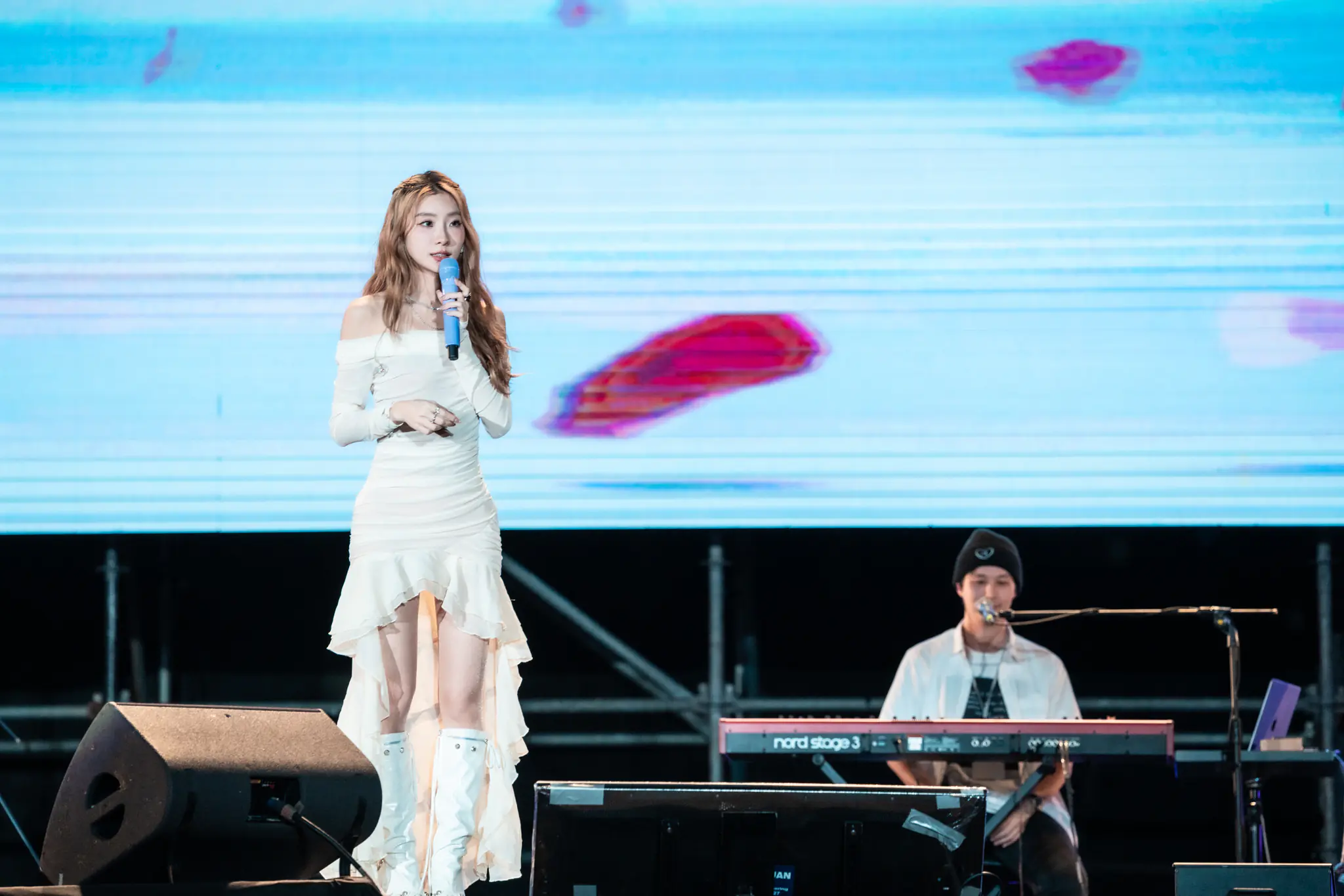 韓國人氣女聲 WENDY 登上高雄櫻花季舞台時,也立刻展現出頂級主唱的實力與舞台魅力。作為韓國超人氣女團 Red Velvet 的主唱,WENDY 一直以穩定又極具爆發力的歌唱實力聞名,這次她以個人歌手身份來到高雄,帶來誠意十足的完整歌單,從開場的〈Like Water〉便以細膩而富有層次的嗓音瞬間抓住全場耳朵。接著陸續演唱〈Why Can’t You Love Me〉、〈Queen Of The Party〉、〈The Chapter You〉、〈Hate2〉等歌曲,時而溫柔抒情、時而展現節奏感十足的舞台魅力,展現她在不同曲風間游刃有餘的音樂實力。來到後段演出,WENDY 以氣氛高漲的〈Wish You Hell〉與充滿夏日感的〈Sunkiss〉將現場情緒推向高潮,清亮又極具穿透力的高音讓台下歌迷不斷尖叫應援,也再次證明她被韓國樂壇公認為「實力派主唱」的地位。這場兼具情感與能量的演出,不僅讓粉絲大飽耳福,也為櫻花季舞台留下令人印象深刻的一刻。