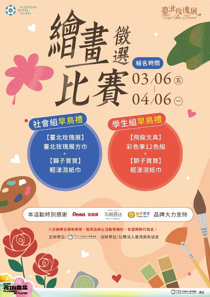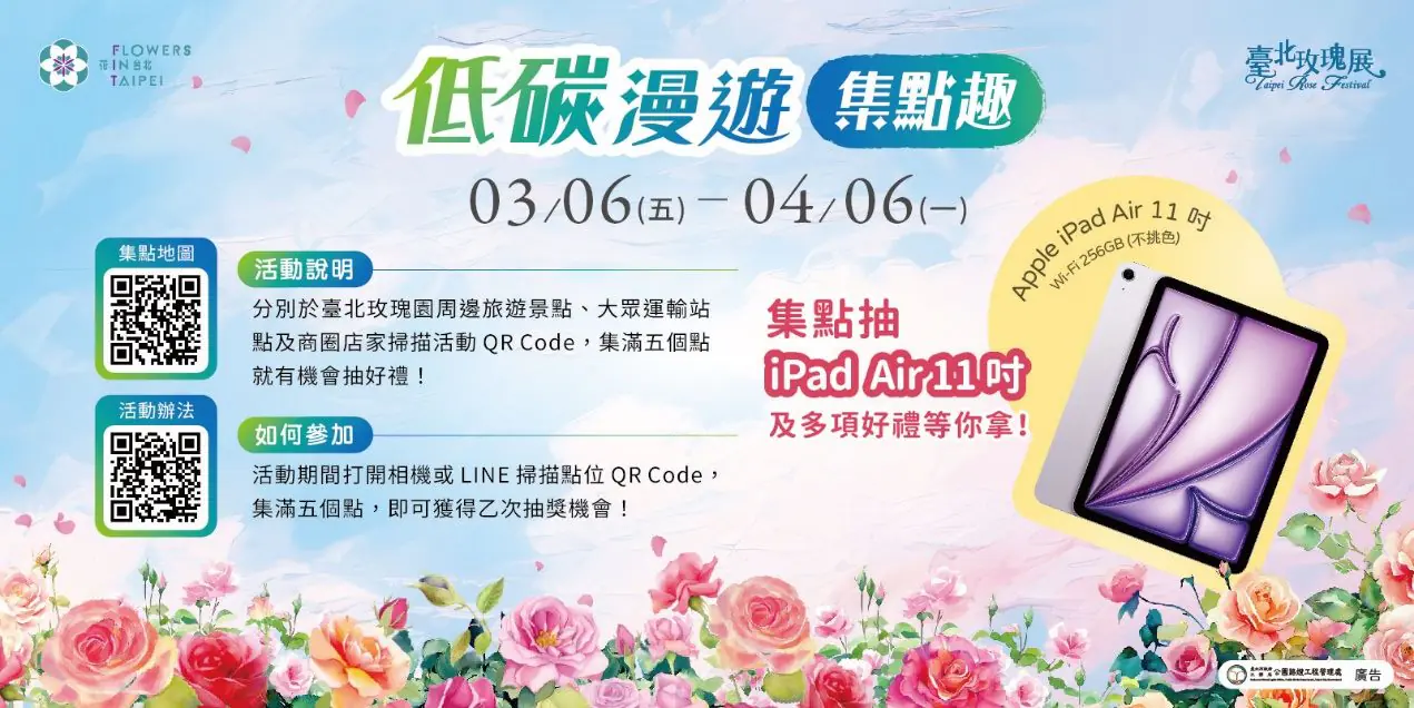 公園處表示,除了白色情人節促成良緣,今年臺北玫瑰展活動亦滿檔精彩可期!祭出iPad及Dyson吸塵器推出「低碳漫遊集點趣」活動,邀請賞花民眾沿途掃碼集點,搭乘大眾運輸順遊花博園區各景點,以及首屆的「繪畫徵選比賽」,分為學生組及社會組,總獎金超過5萬元,期待大家能揮灑色彩畫下玫瑰園美景,發揮創意及巧思,共同為今年臺北城的春日風景留下印記。如果想了解更多臺北玫瑰展的情報,可至臺北玫瑰展FB粉絲專頁查詢或上花in台北官方網站查詢。(圖/北市府提供)