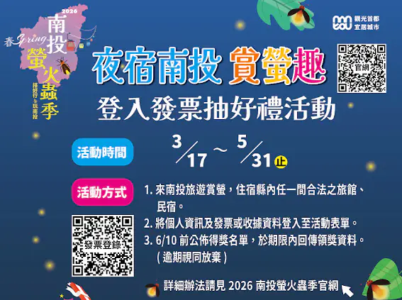 縣府觀光處指出,若需要了解更多活動細節與報名資訊,請至「2026南投螢火蟲季」官方網站或臉書粉絲專頁「樂旅南投」查詢。