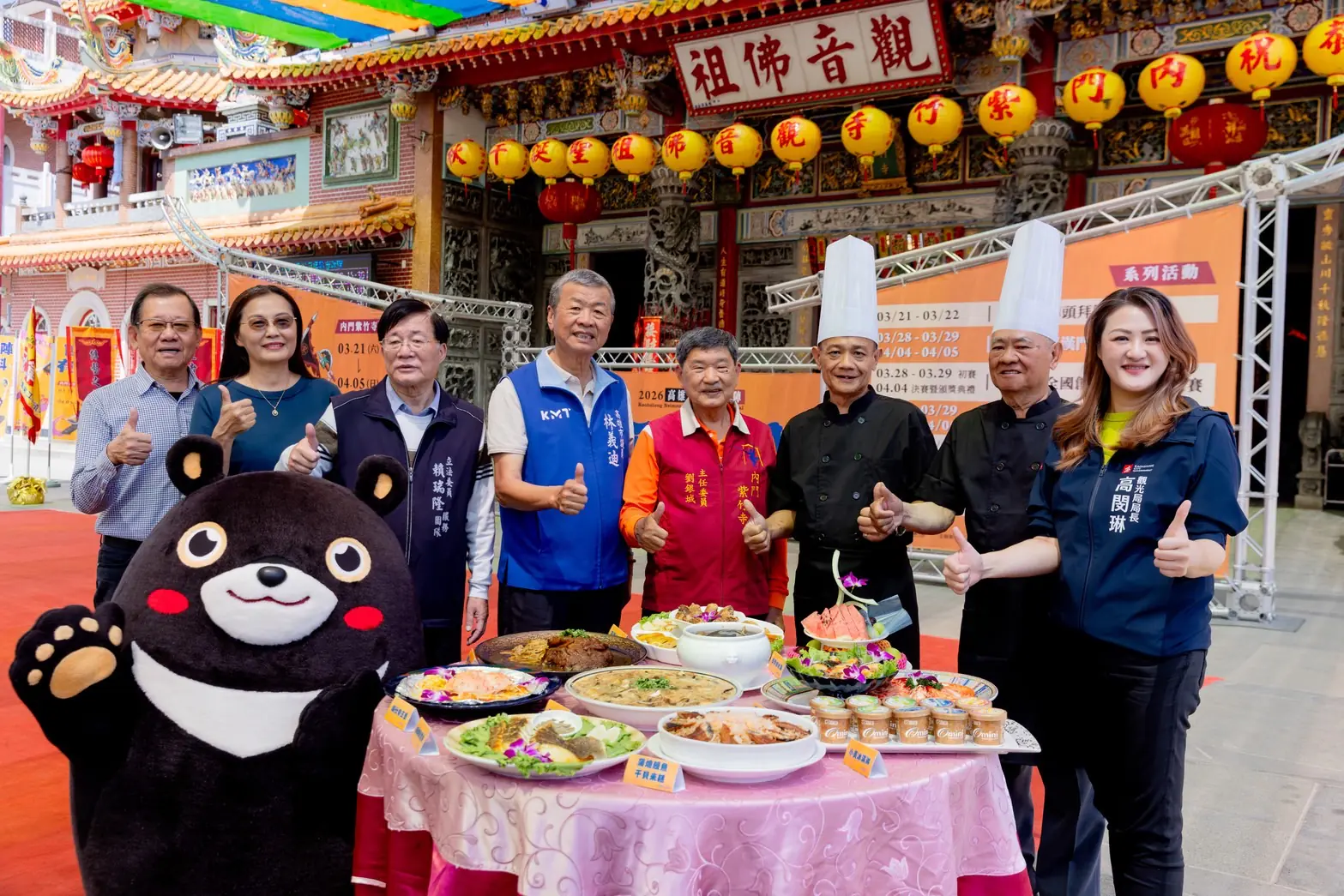 百年陣頭文化,高雄閃耀傳承!備受全國矚目的「2026高雄內門宋江陣」將於3月21日至4月5日,於內門紫竹寺盛大登場。高雄市政府觀光局今(17)日舉辦記者會,開場由「內門國中宋江陣」及「宗興武藝創意宋江陣」帶來熱血沸騰的尬陣交流,並由觀光局長高閔琳與內門紫竹寺主委劉銀城共同為宋江陣頭旗結綵,宣布「2026高雄內門宋江陣」系列活動全面啟動。每年讓饕客引頸期盼的「宋江大宴」,今年由神明欽點的掌鼎總舖師薛志龍率領徒弟團隊聯手端出澎湃辦桌佳餚;其父薛清己,為內門「四合一」辦桌文化重要推手亦親臨現場,展現精湛廚藝世代傳承以及高雄地方飲食文化的深厚底蘊,誠摯邀請海內外旅客前來高雄內門參香祈福、參與遶境活動,欣賞宋江陣頭、為參賽隊伍加油,品嚐「總鋪師經典台灣料理「宋江大宴」辦桌菜,春季旅遊,首選高雄!