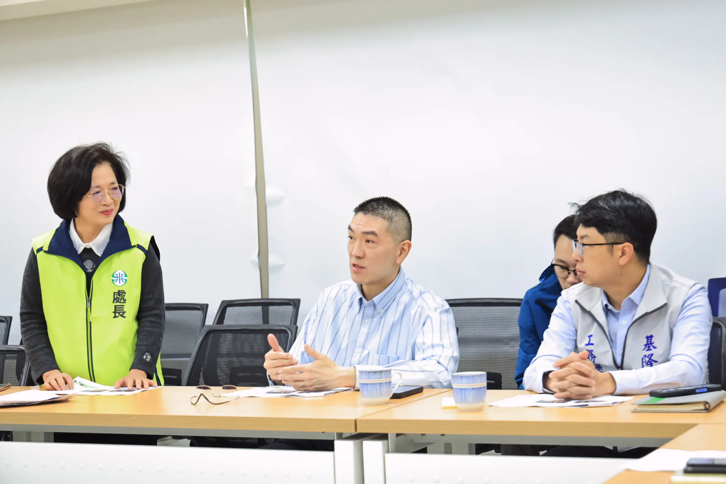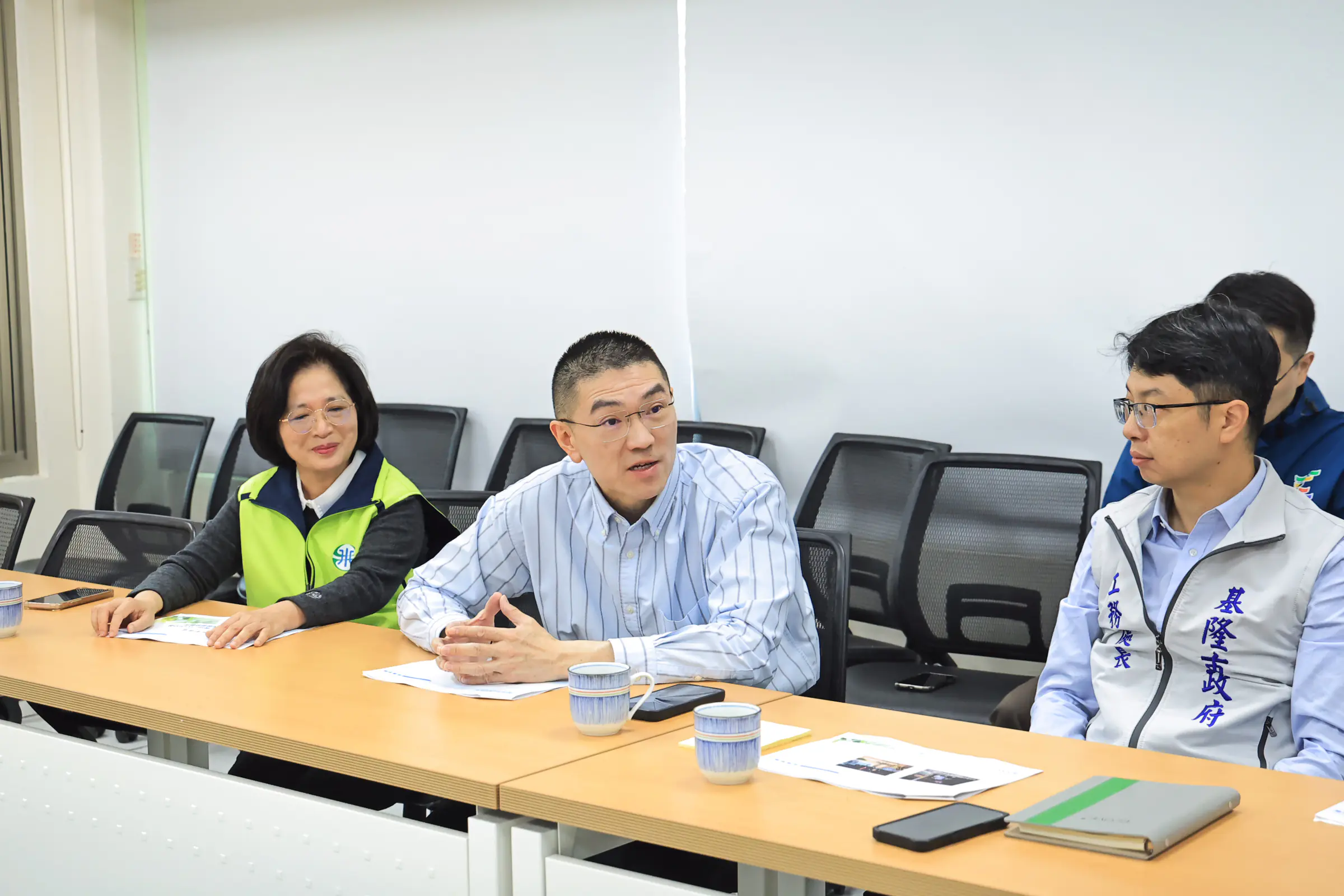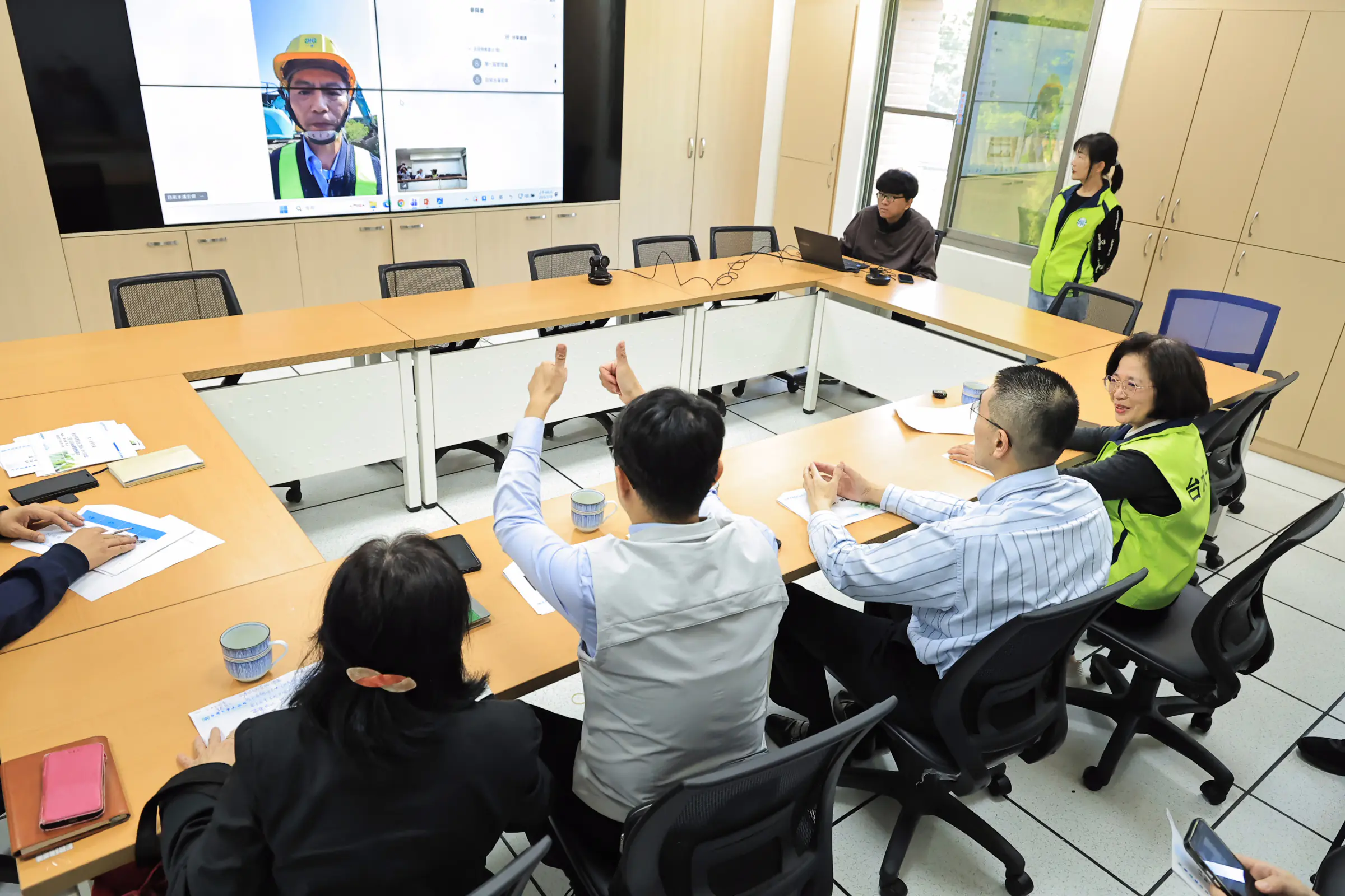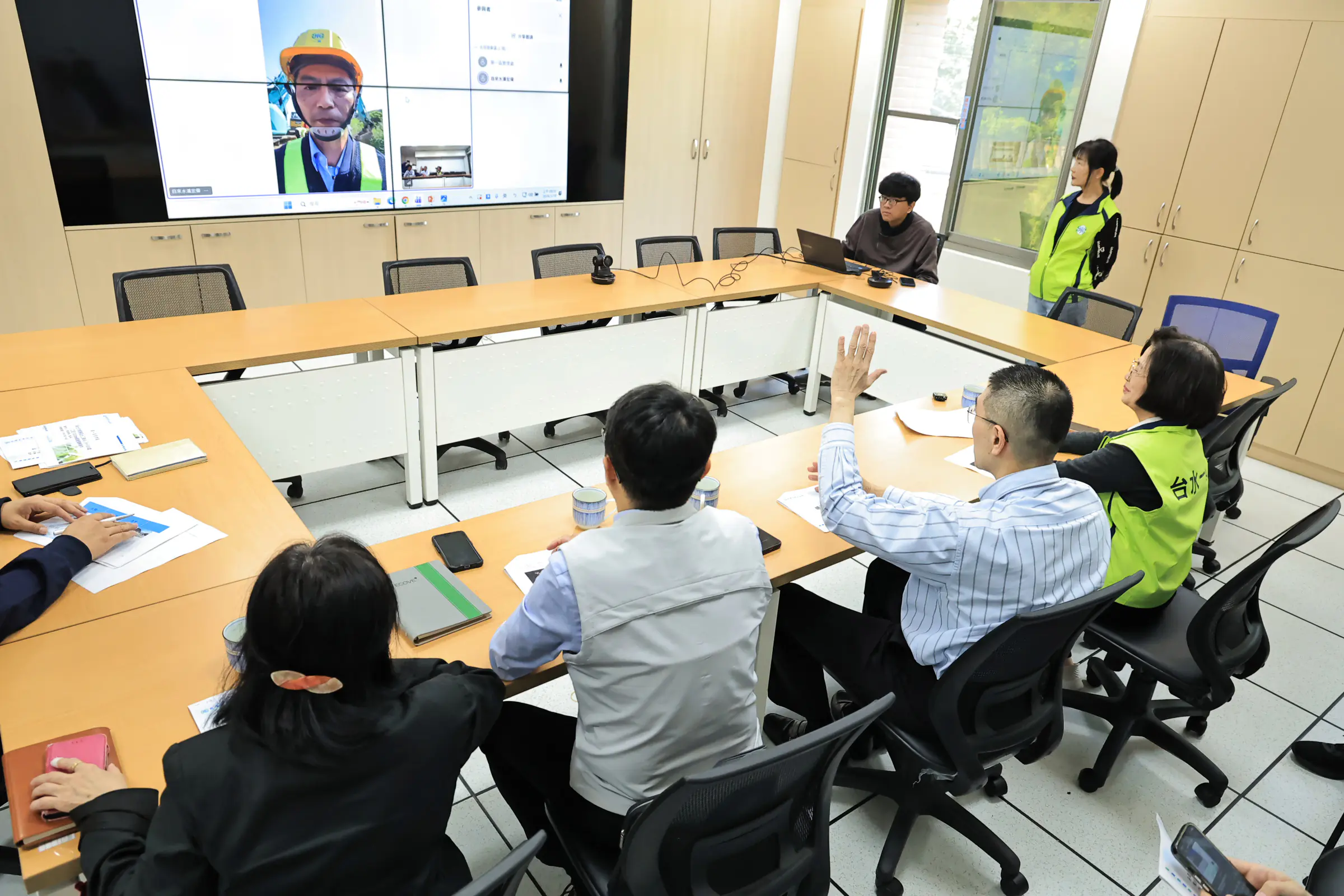在聽取簡報過程中,謝國樑詳細了解目前修復工程進度、替代供水措施及後續復水時程,並透過視訊連線親自向現場搶修人員致意,感謝大家在第一時間投入搶修作業,不分晝夜守護市民用水。