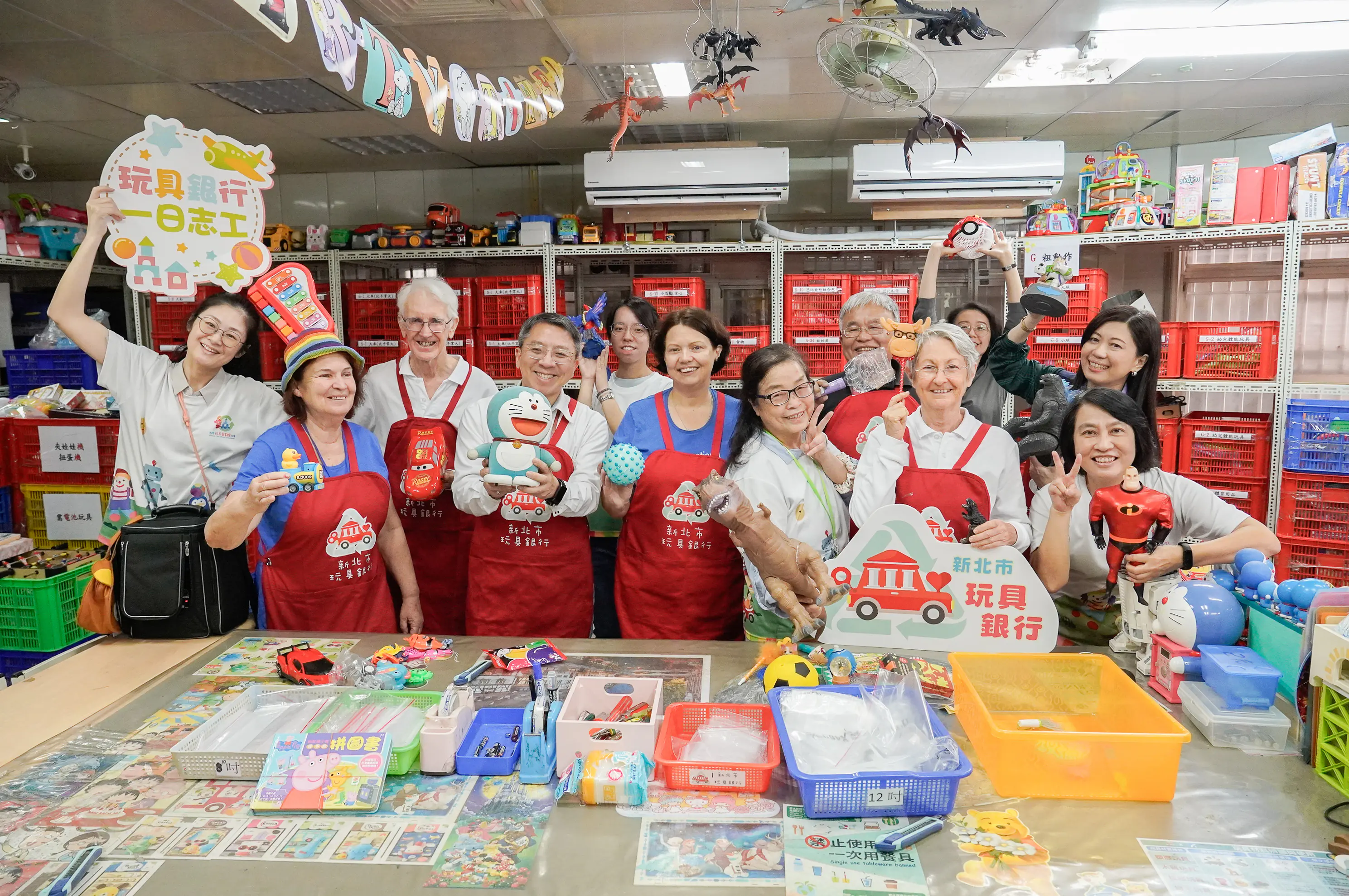 參訪團Robyn和 Steven Davis夫婦穿著澳洲《妙妙犬布麗》的T恤,由於這是澳洲著名的牧牛犬布麗動畫,國內也有引進節目,工作人員LuLu立即找來回收的布麗玩具,令兩人非常的開心。參訪團也穿起玩具銀行紅色的志工服,一起體驗回收、分類和整理。