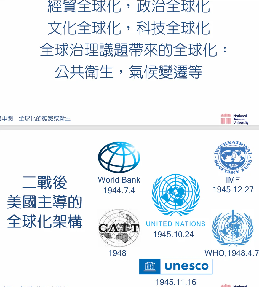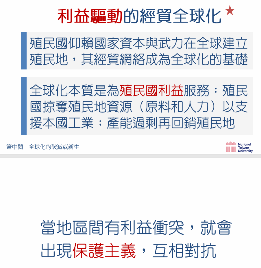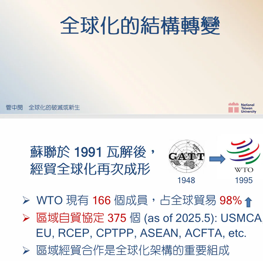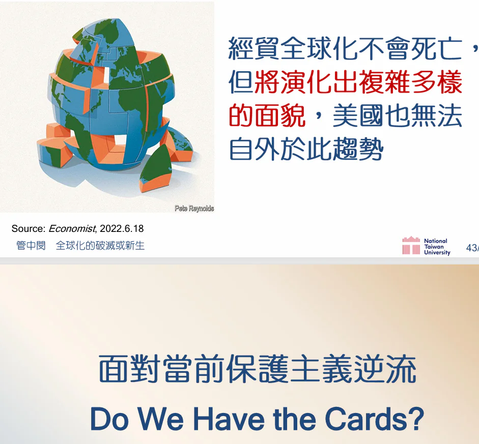 針對全球化定義,管中閔表示,多數人在討論全球化衰退時,實際上多聚焦於經濟與貿易層面。他指出,經貿全球化可視為全球各地區經濟活動,藉由貿易、金融等網絡持續連結與發展的過程。然而,全球化不僅限於經濟領域,還涵蓋政治、文化、科技、氣候治理等多元議題。例如,政治全球化可見於各國透過雙邊及多邊條約、國際組織建立合作;文化全球化則體現在知識、影視、音樂等跨境流動;科技與氣候變遷議題也已成為現代全球共同治理的重要範疇。