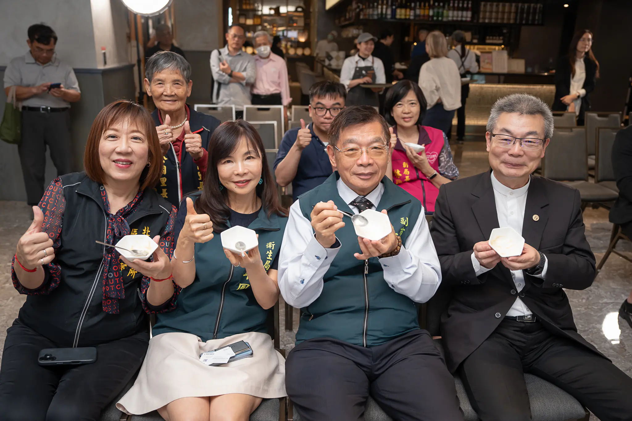 ▲台南市政府副市長姜淋煌、衛生局長李翠鳳及副局長林碧芬、北區長潘寶淑、健康保險署南區業務組賴大年副組長等多位來賓嘗鮮「軟質餐」。(圖/奇美食品提供)