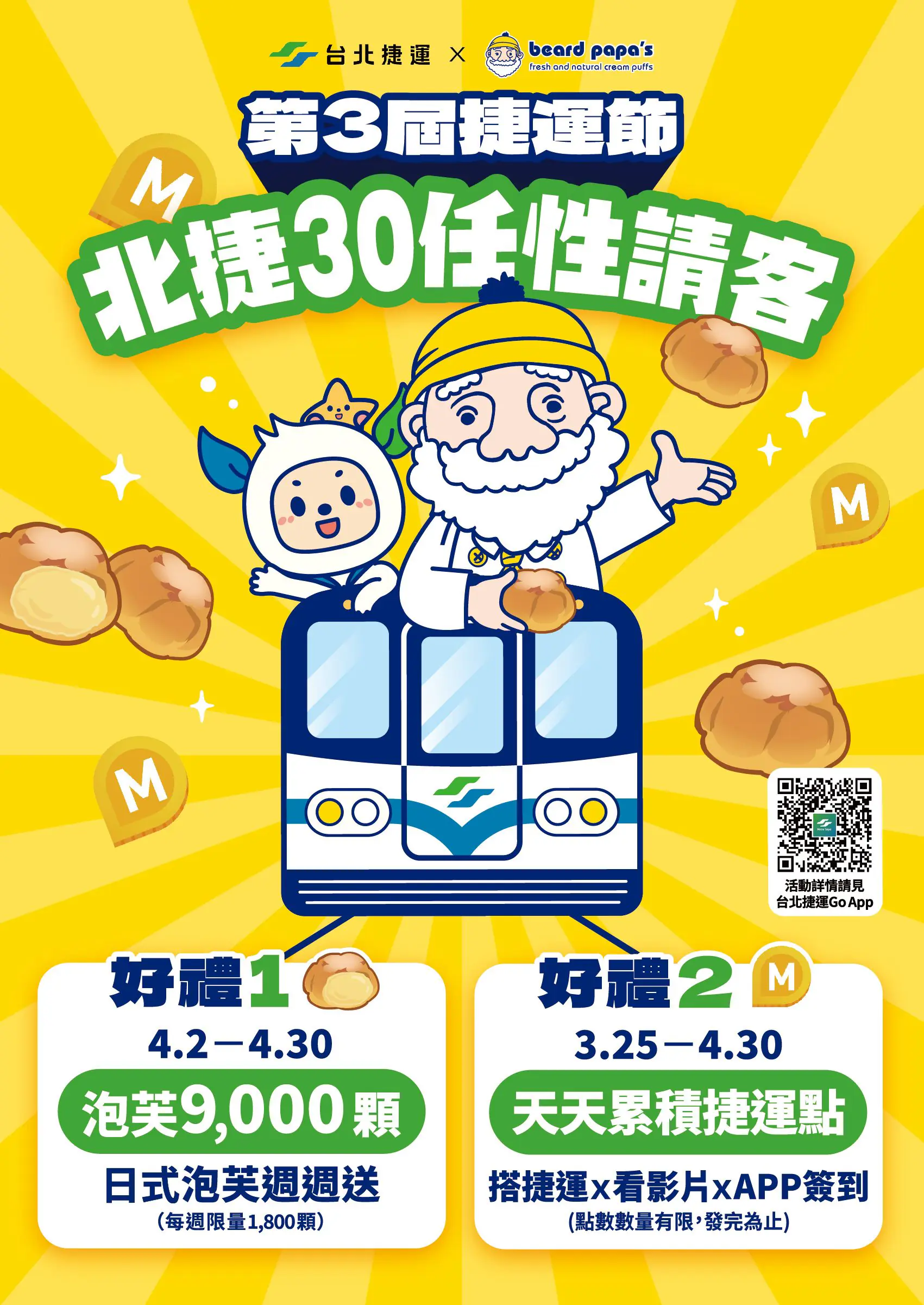歡慶第3屆捷運節,「捷運點數派對」正式開跑!3月25日至4月30日,下載或開啟「台北捷運Go」App,領捷運點換beard papa’s日式香草泡芙、抽捷運年票,共有捷運點38萬點、泡芙9,000顆,讓「北捷30感恩大放送」!