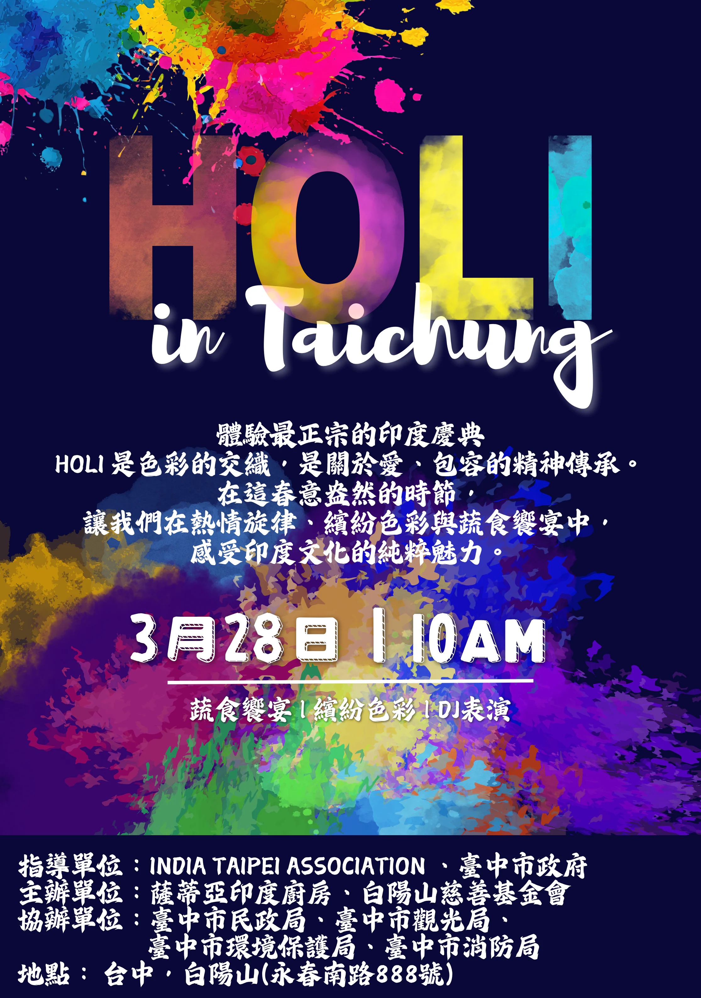 民政局表示,「Holi in Taichung 2026-色彩狂歡節」將在白陽山著名的360度遼闊景觀中展開,現場規劃彩水水球體驗,讓民眾在水霧與繽紛色彩交織的歡樂氛圍中,感受Holi節慶的熱情與活力,活動現場也將搭配DJ播放寶萊塢音樂,帶動民眾隨節奏互動同樂;另安排專業舞團演出,透過融合印度傳統與現代風格的舞蹈表演,展現節慶奔放熱烈的文化魅力,讓白陽山成為春日裡充滿異國風情的文化舞台。