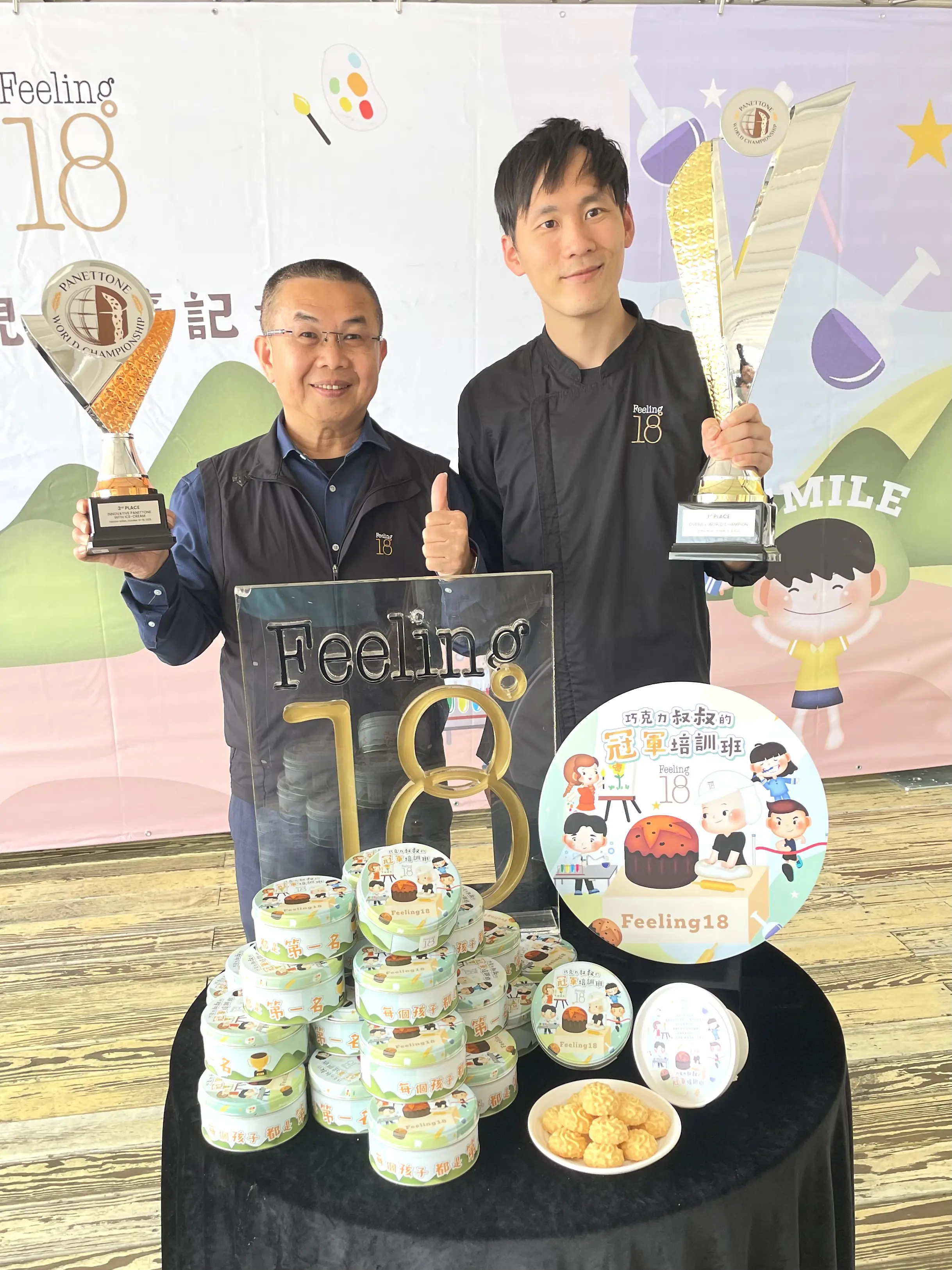 Feeling18創辦人茆師傅(左)與勇奪世界冠軍的Feeling18主廚蔡約群(右)手持冠軍獎盃合影。