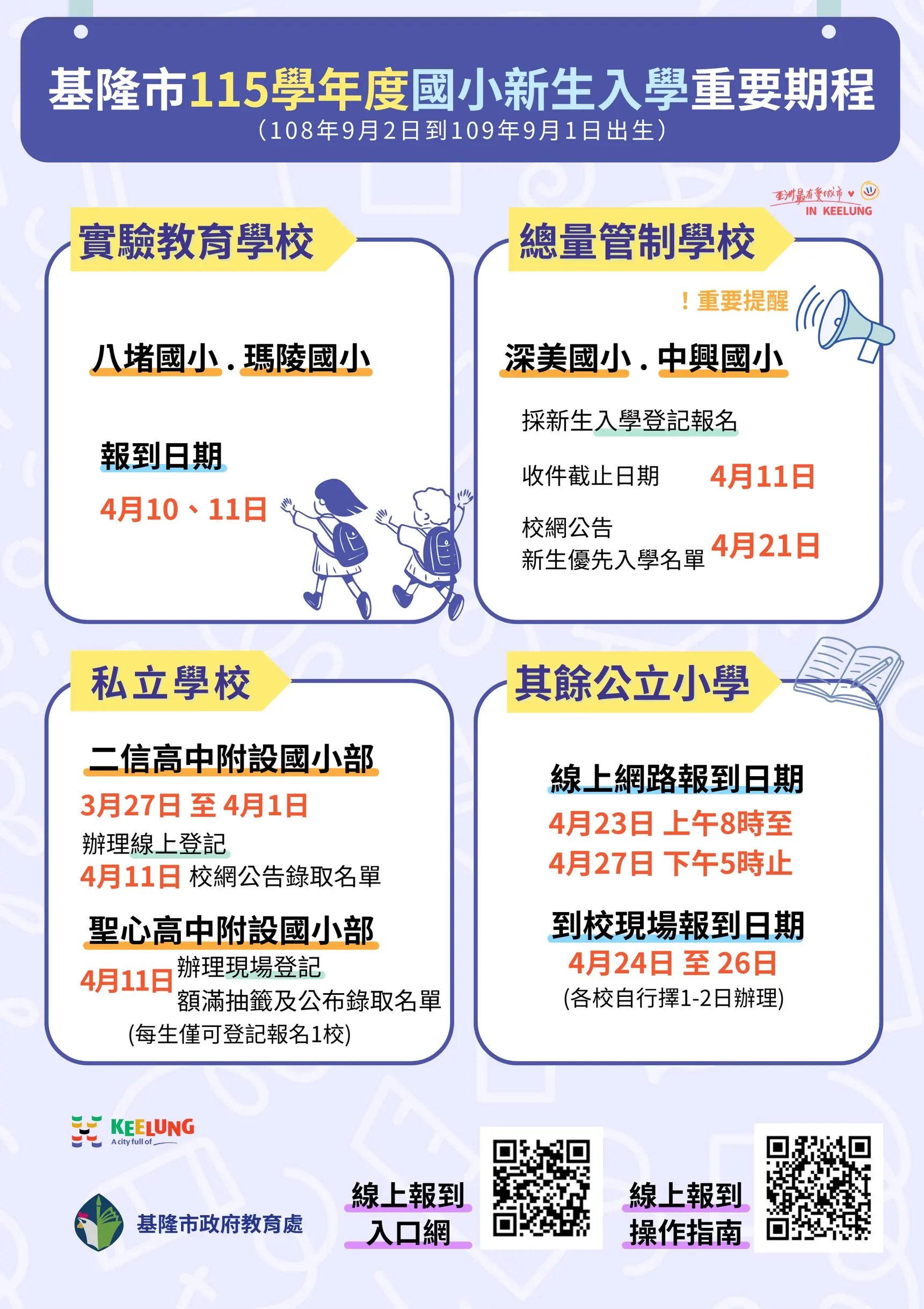 又到了每個新學年度國小新生報到的時間,家有年滿六足歲兒童(108年9月2日到109年9月1日出生)的家長們請注意!115學年度公立國小分發日期以115年3月20日學童之戶籍所在地進行分發。基隆市總量管制學校計有深美國小與中興國小二校,學校在4月初開始受理家長繳納登記入學相關文件,收件截止日為4月11日;實驗教育學校,八堵國小與瑪陵國小則是在4月10、11日辦理登記;另私立二信高級中學附設國小部將在3月27日至4月1日以線上方式進行登記;而私立輔大聖心高級中學附設國小部的新生登記作業在4月11日到校辦理。