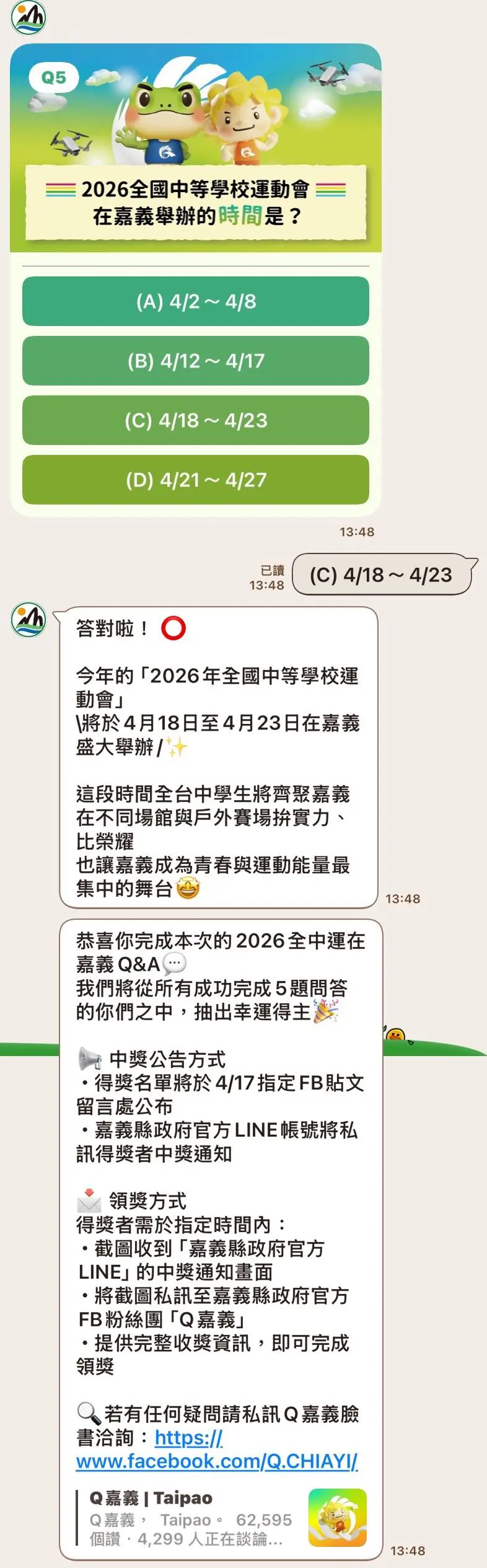 完成測驗者資料將由系統自動記錄,抽獎時將從完成遊戲者中隨機抽出中獎者,並以LINE通知,同時在「Q嘉義」臉書粉絲專頁發布得獎名單。