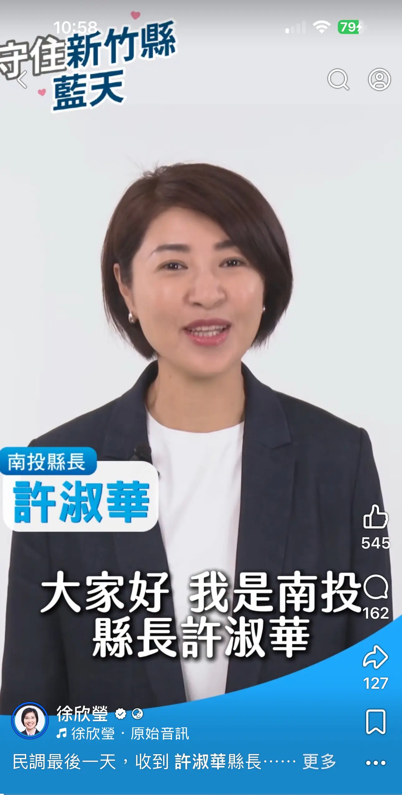 許淑華在影片中以「好姐妹」相稱,親自為徐欣瑩加油打氣,強調兩人過去在立法院共事的情誼,並向新竹縣民喊話「新竹加油、新竹縣加油」,傳遞支持訊號。這段表態不僅情感濃厚,也被外界視為政治立場的重要轉折。尤其在初選進入最後階段,任何重量級人物的動向都可能牽動選情走向。