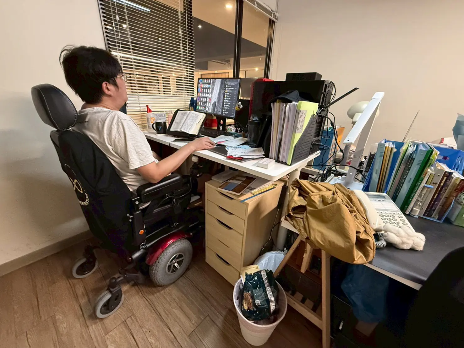 勞工局分享,有一名從事行政工作的身心障礙勞工,因身體功能逐漸退化,原本日常工作面臨行動不便與安全風險。在雇主與本人向勞工局提出職務再設計需求後,市府即安排專業人員進場評估,協助導入電動輔具、調整工作桌高度,並改善場域無障礙設施,讓其能在安全且友善的環境中持續穩定就業。
