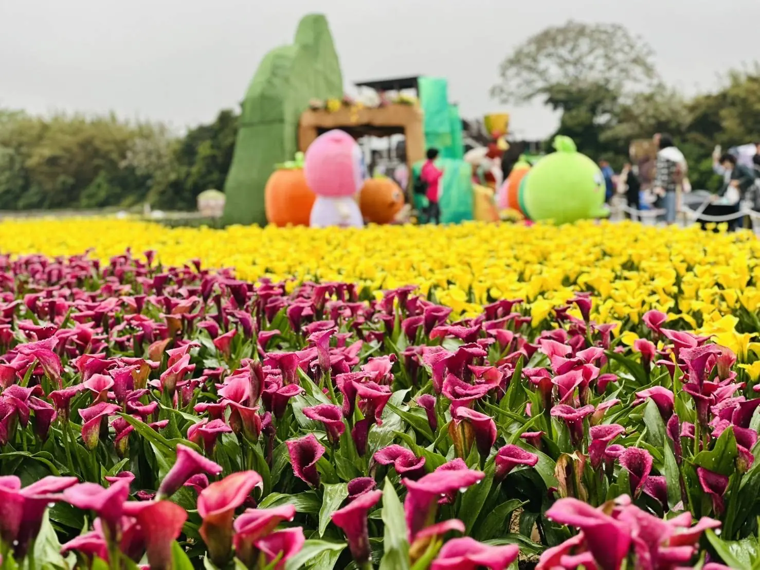 2026桃園彩色海芋季《園夢奇芋記》現場有超過6萬5千株彩色海芋,更搭配小蒼蘭、百合、波斯菊,超過14個不同品種,總共高達20萬株的夢幻花草綻放。
