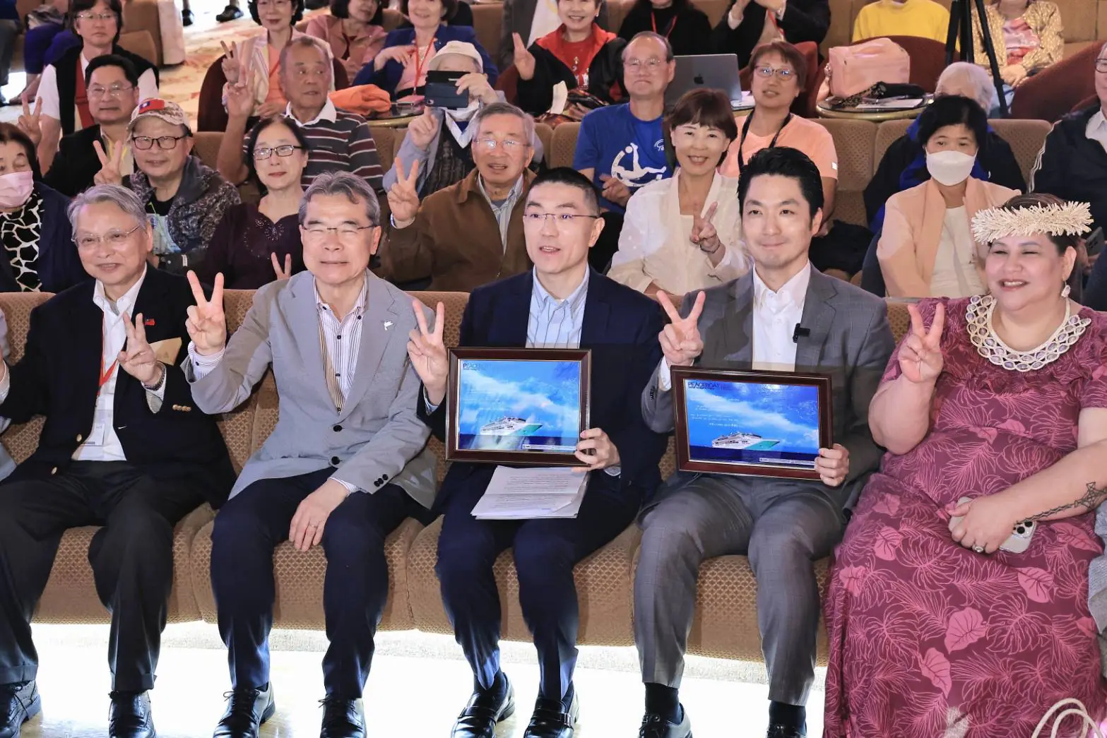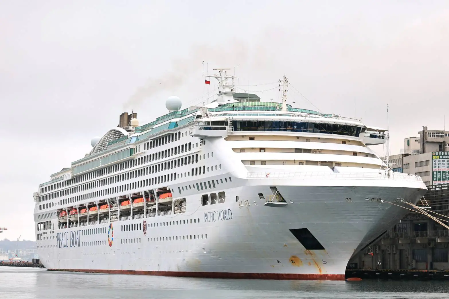 日本和平船(Peace Boat)第122航次「太平洋世界號」(Pacific World)27日清晨停靠基隆港。基隆市長謝國樑及台北市長蔣萬安共同出席發表,吉岡達也創辦人及令狐榮達會長親自歡迎。