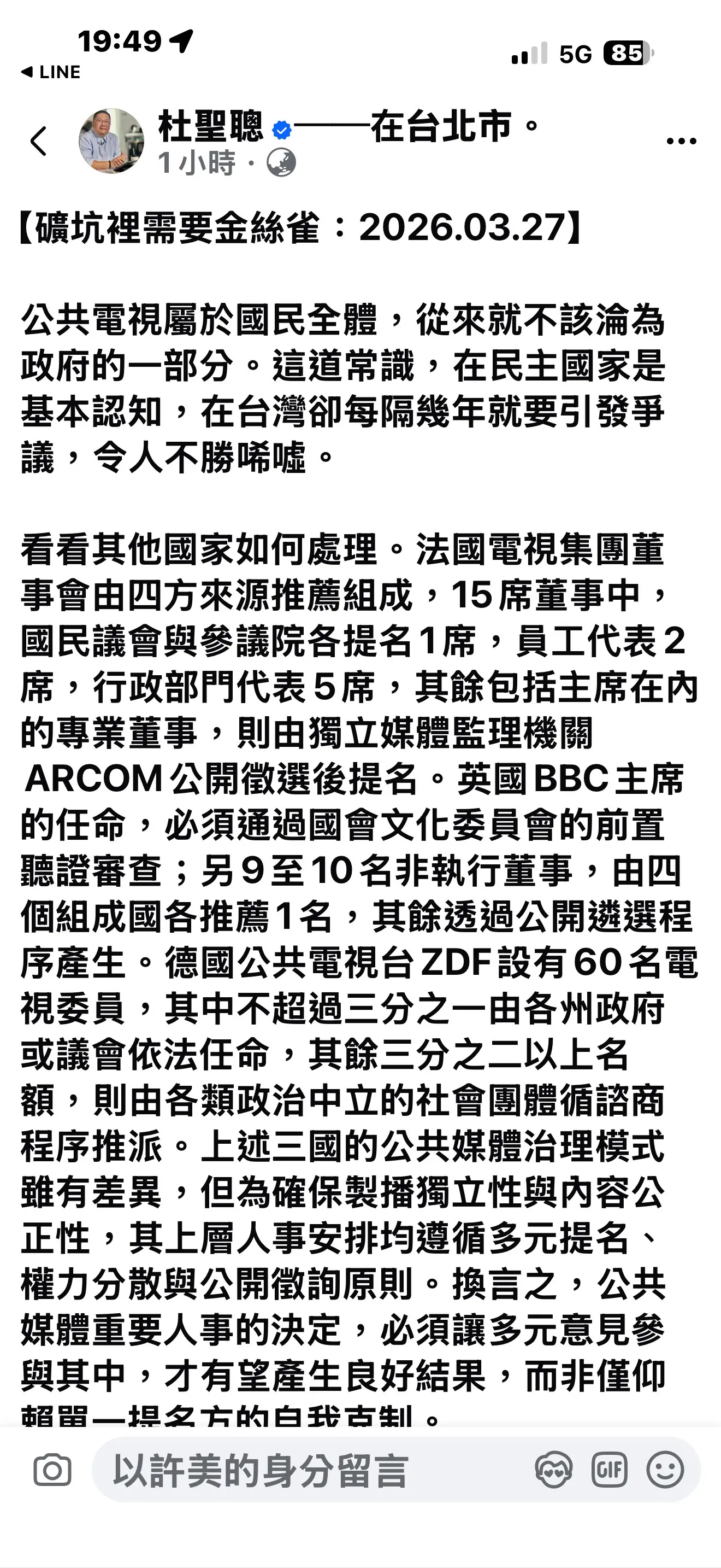 公視第八屆董監事審查委員、銘傳大學廣電系主任杜聖聰臉書發文,呼籲文化部延後第二次審查會議,先完成跨黨派諮商再進行後續審查。圖/杜聖聰臉書