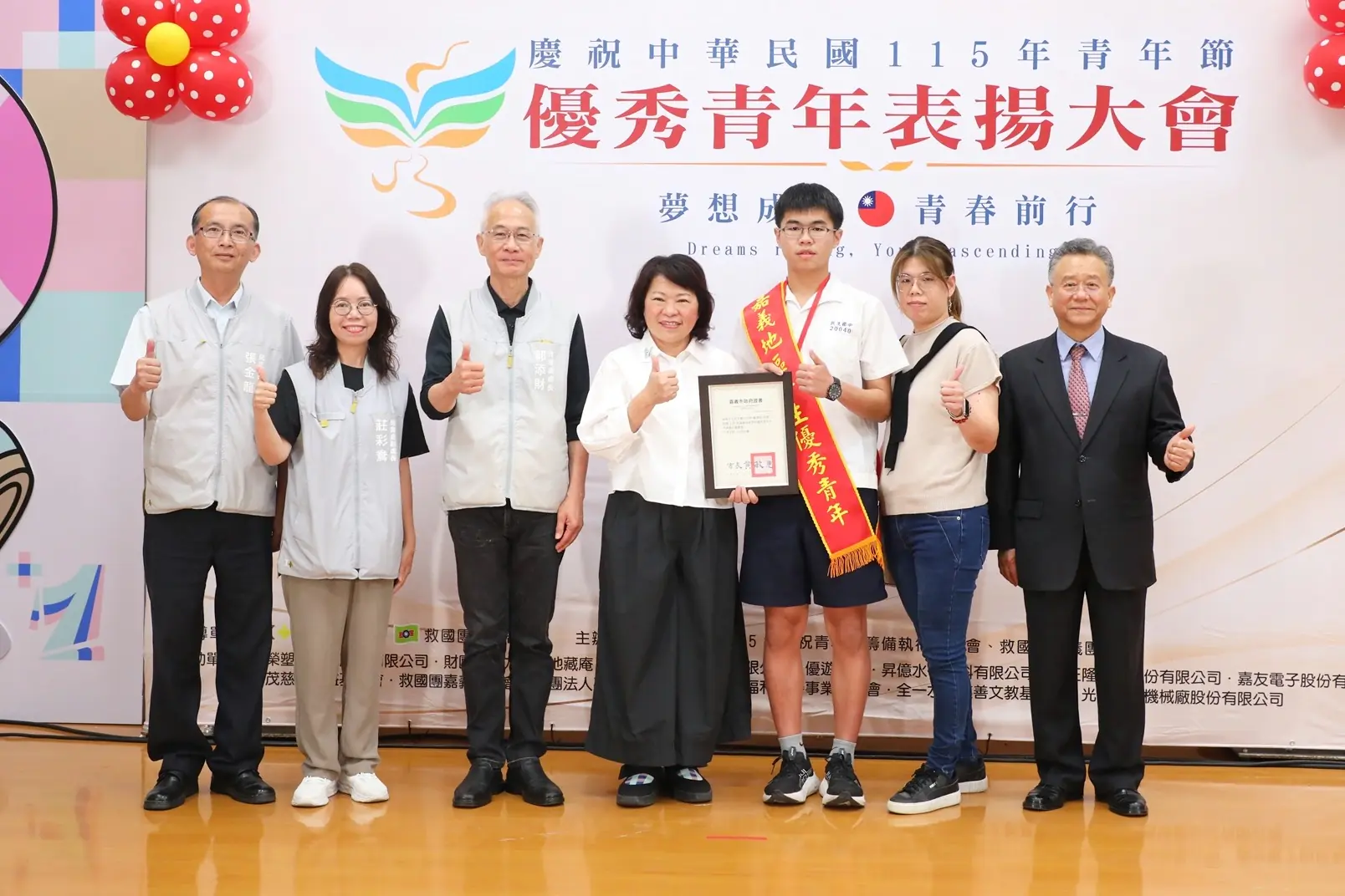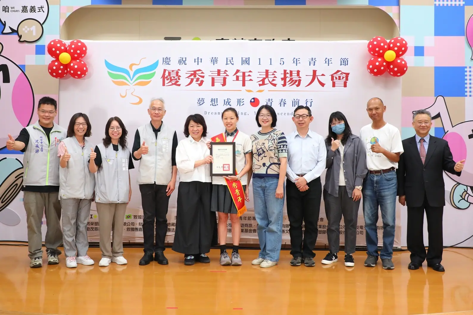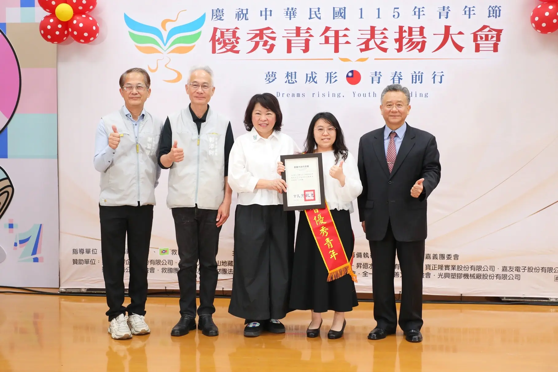青年節即將到來,今日嘉義市長黃敏惠出席115年嘉義地區慶祝青年節優秀青年表揚大會,為95位來自社會優秀青年、嘉義地區各大專院校、中等學校優秀青年一一頒發獎項,鼓勵各領域脫穎而出獲選優秀的青年「夢想成形、青春前行」,能勇敢逐夢,跳脫框架,為自己及社會開創更美好的世代。