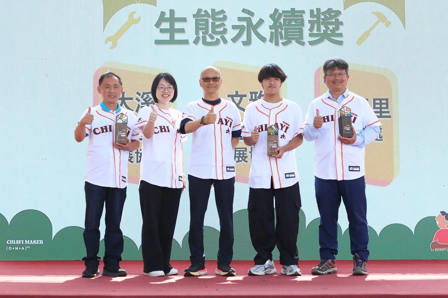 環保局指出,本次活動的一大亮點是別具意義的年度獎盃,由藝術職人吳曉芸與團隊共同展現創意。獎盃底座選用退役電線桿的木製橫擔,上層則是社規師學員親自學習工藝,利用回收老宅舊窗玻璃設計成的「鑲嵌玻璃透光屋子」,象徵嘉義市木都歷史的保存與永續再生的核心理念。