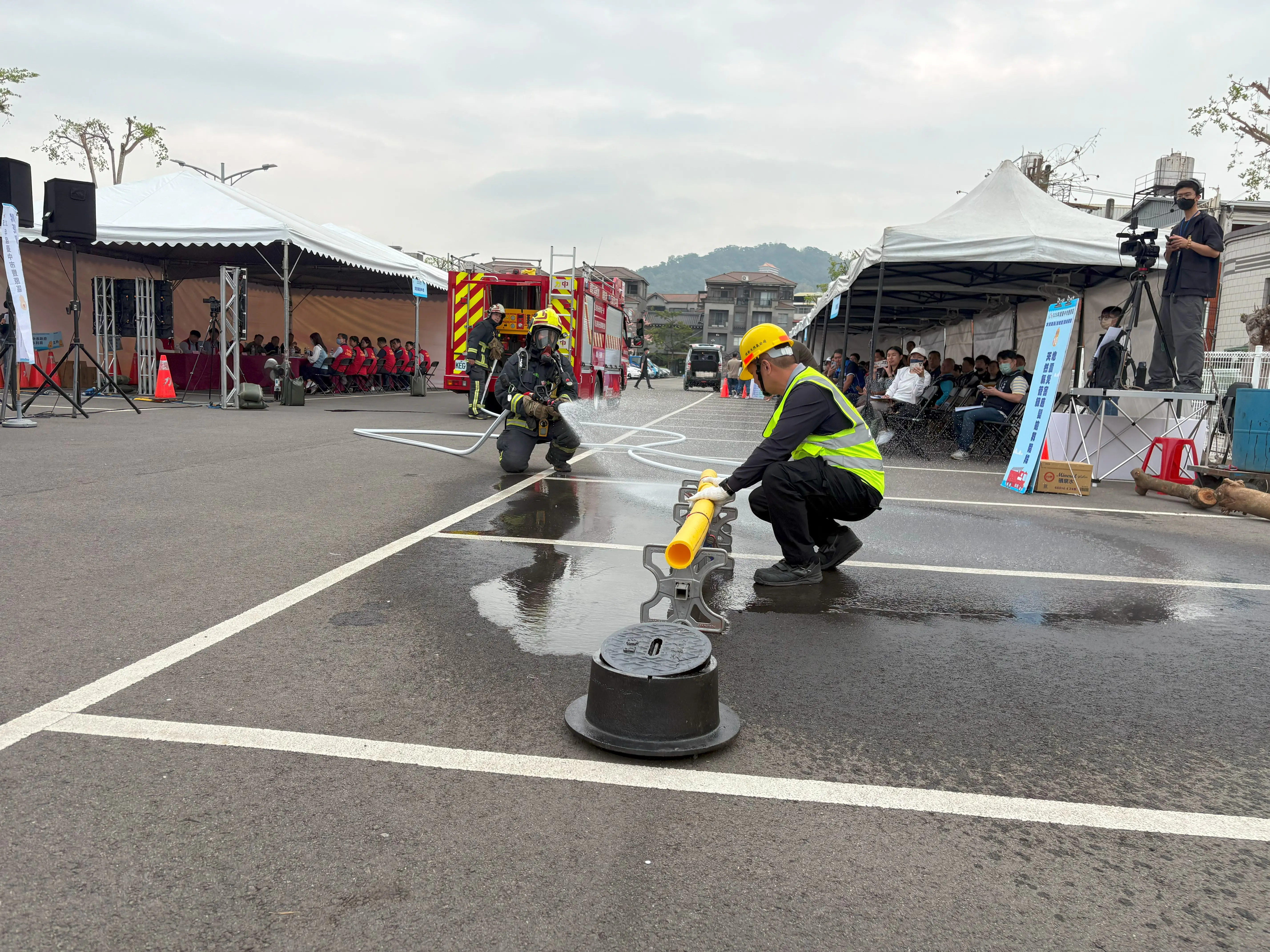 水利局說明,此次演習以汛期水災結合地震的複合型災害情境進行,從成立災害應變中心、各編組進駐待命,到災前預警與通報機制啟動,並模擬環保志工清理側溝、排水系統疏通、沙包發放、弱勢族群預防性疏散收容等作為;災時則進行大規模淹水警戒、民眾強制撤離、救溺行動、道路橋梁封閉、民生物資供應及災情回報;災後亦演練維生管線搶修及復原重建流程,全面驗證各項防救災作業運作。