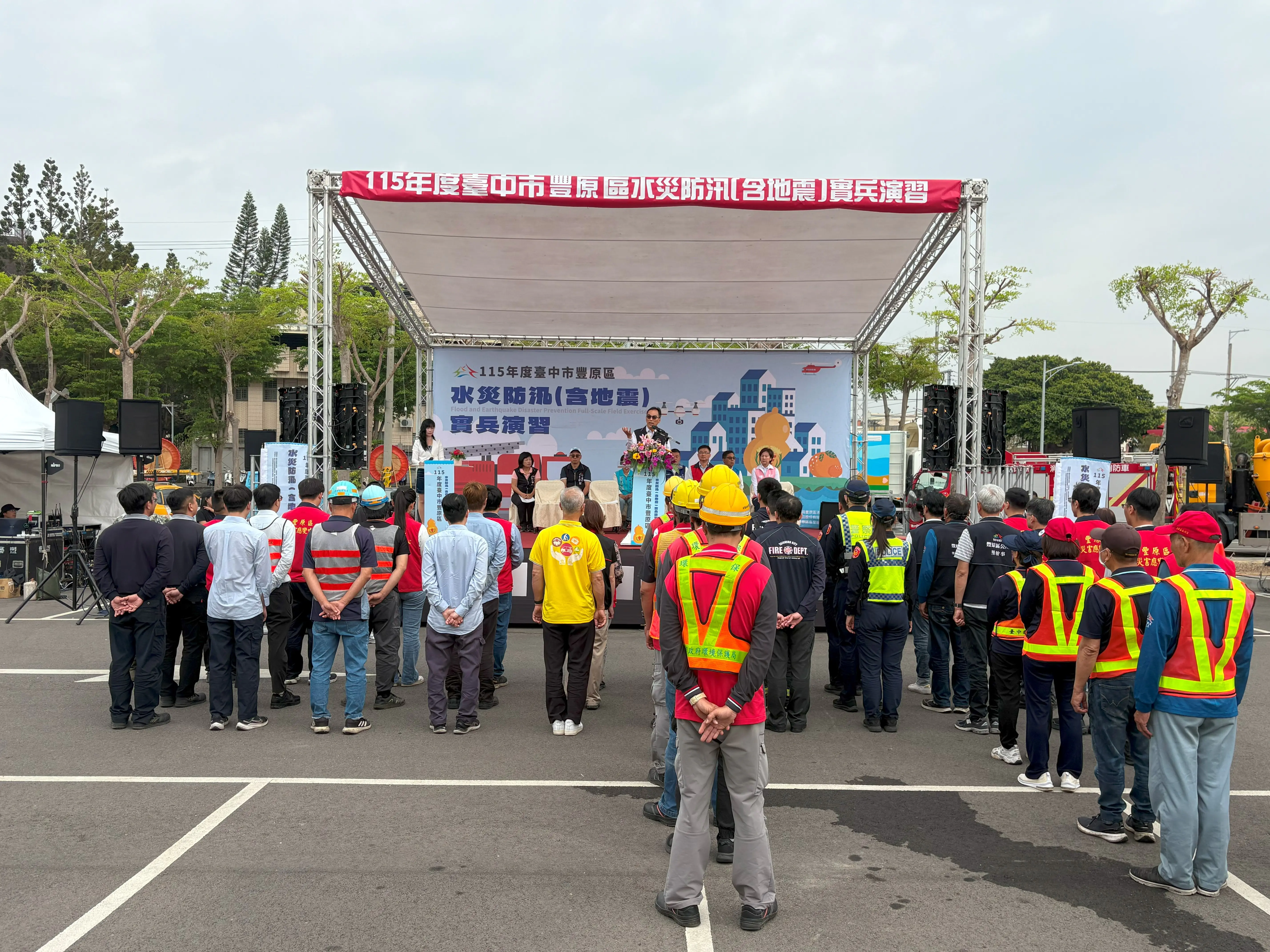 此次演習由市府水利局主任秘書林志鴻擔任統裁官,豐原區長洪峰明擔任指揮官,整合消防局、警察局、環保局、衛生局,以及台灣電力公司、自來水公司、中華電信公司、欣彰天然氣公司、國軍後備指揮部等單位共同參與,並由南村里里長謝見忠率環保志工隊投入支援,結合公私部門與志工力量,強化整體防救災協作能力。現場亦有水利局、消防局、警察局豐原分局、區公所代表及各級民意代表、里長到場觀摩。