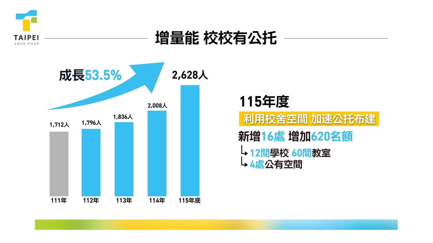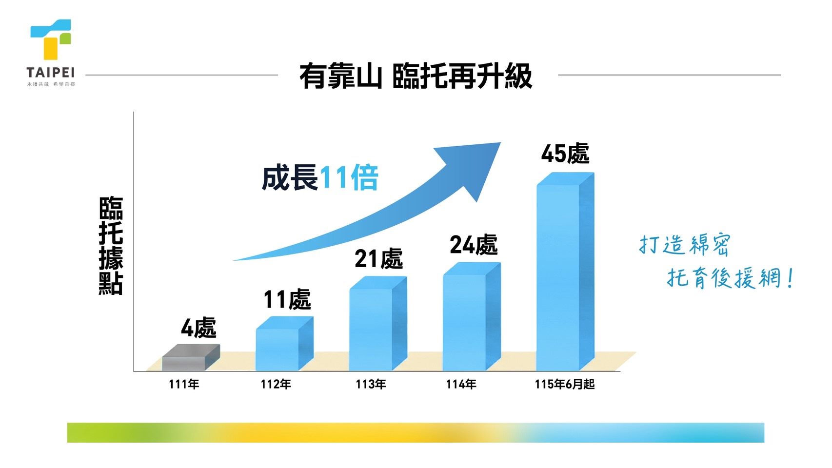臺北市政府強調,市府團隊要打造一個「家長有後援」的城市。為支持育兒家庭,市府從硬體量能擴充到經濟負擔減輕,再到量能擴增的喘息服務,市府將持續加快腳步,透過多元、彈性的政策組合,成為臺北家長最堅實的育兒後盾。